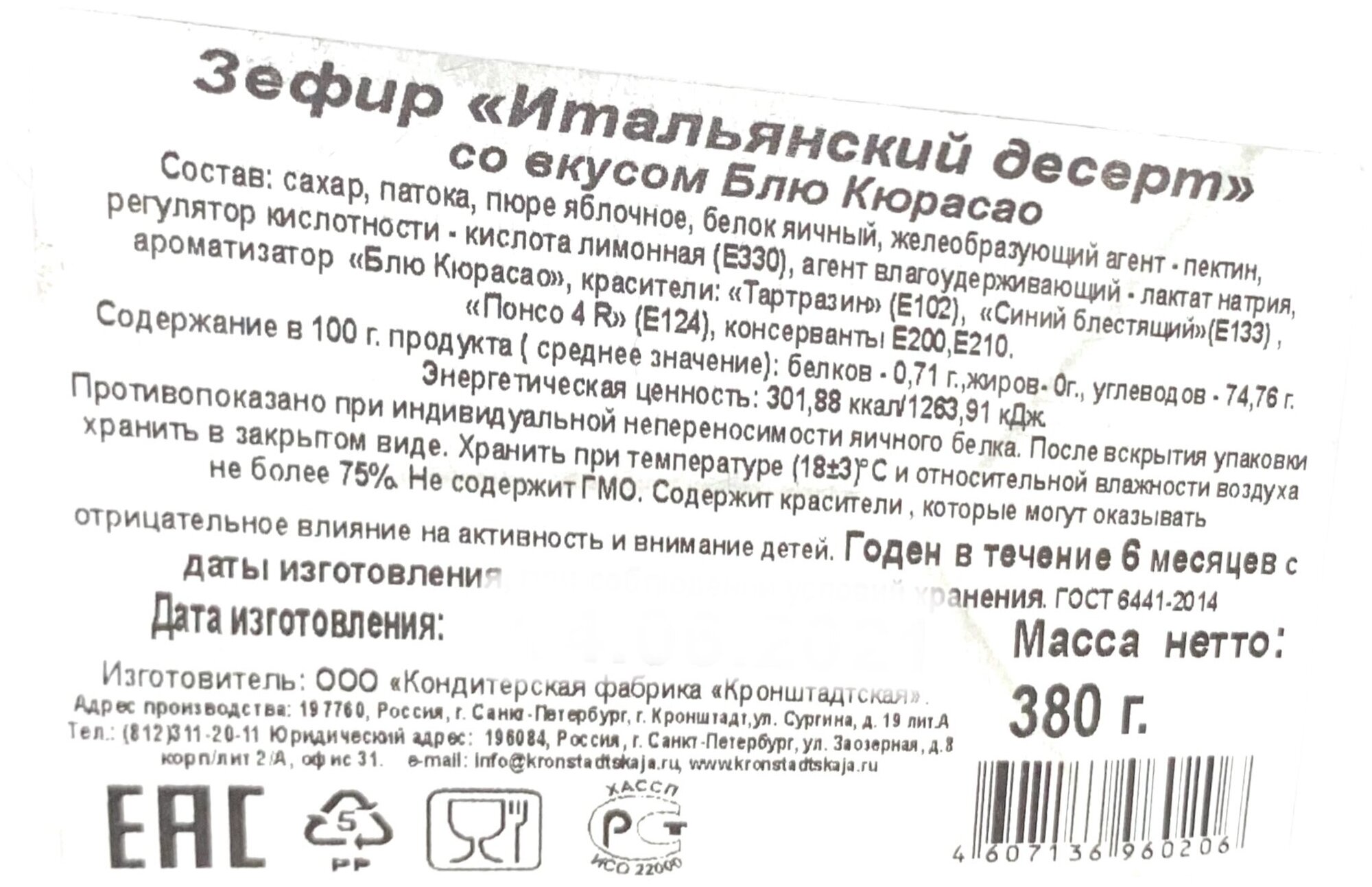 Зефир КФ Кронштадтская Итальянский десерт со вкусом Блю Кюрасао 380 г