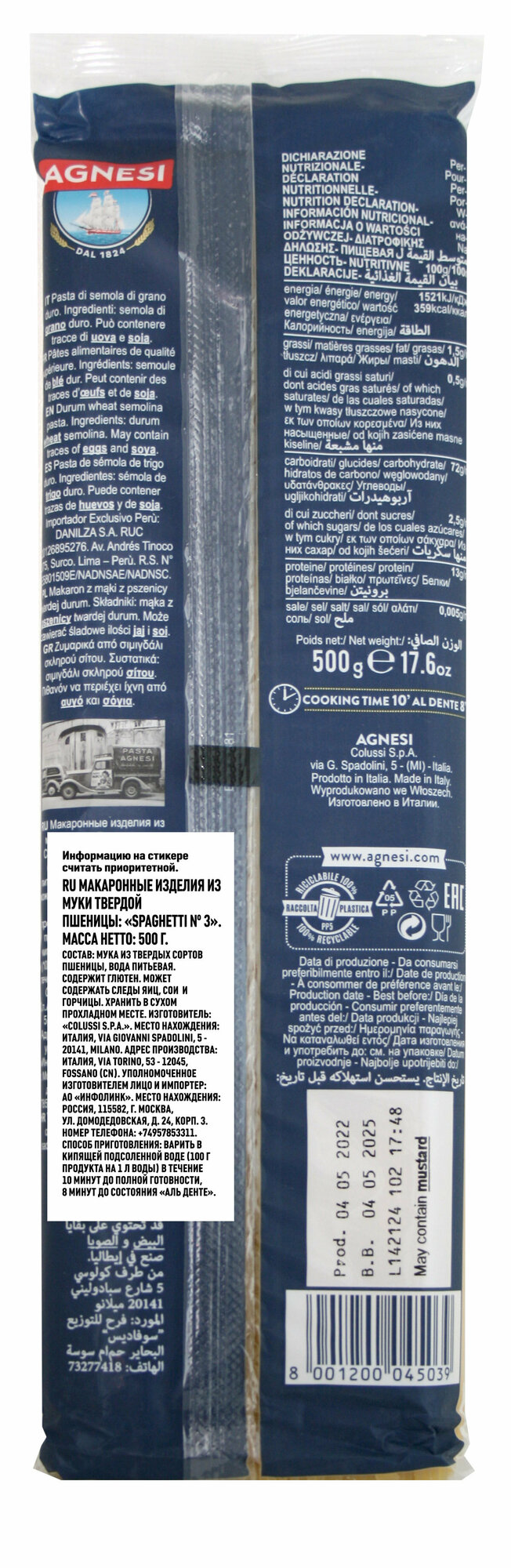 Agnesi (Аньези) – одна из старейших марок макарон в Италии. Лучшее зерно, искусство мельников и технология производства по канонам классической сушки почти два века гарантируют потребителям качество, возможно, лучших макарон Италии.
