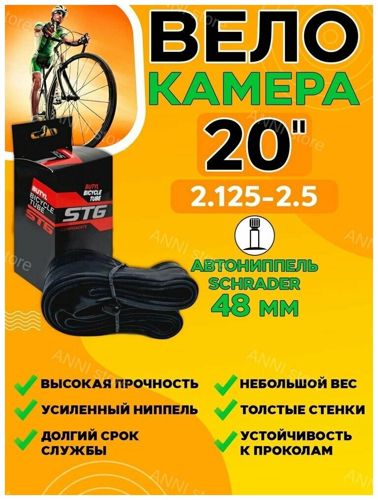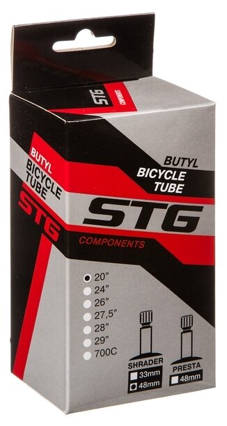 Камера велосипедная STG, диаметр камеры 20 дюймов, допустимая ширина покрышки от 2.125 до 2.5 дюймов. Материал бутил, ниппель шредер (автомобильный), длина автониппеля 48 мм. Упакована в коробку.