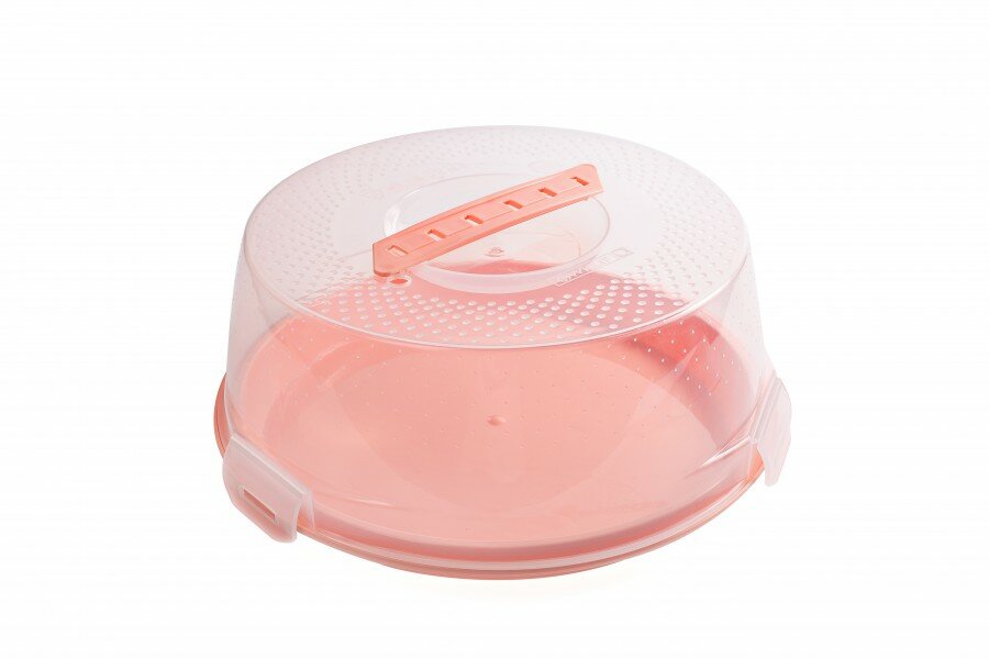 Пластиковый контейнер для торта с крышкой. Крышка выполнена из прозрачного пластика, через который хорошо видно содержимое контейнера. Имеет защелки по бокам и ручку по центру, благодаря которым контейнер удобно переносить и размещать на хранение.