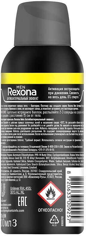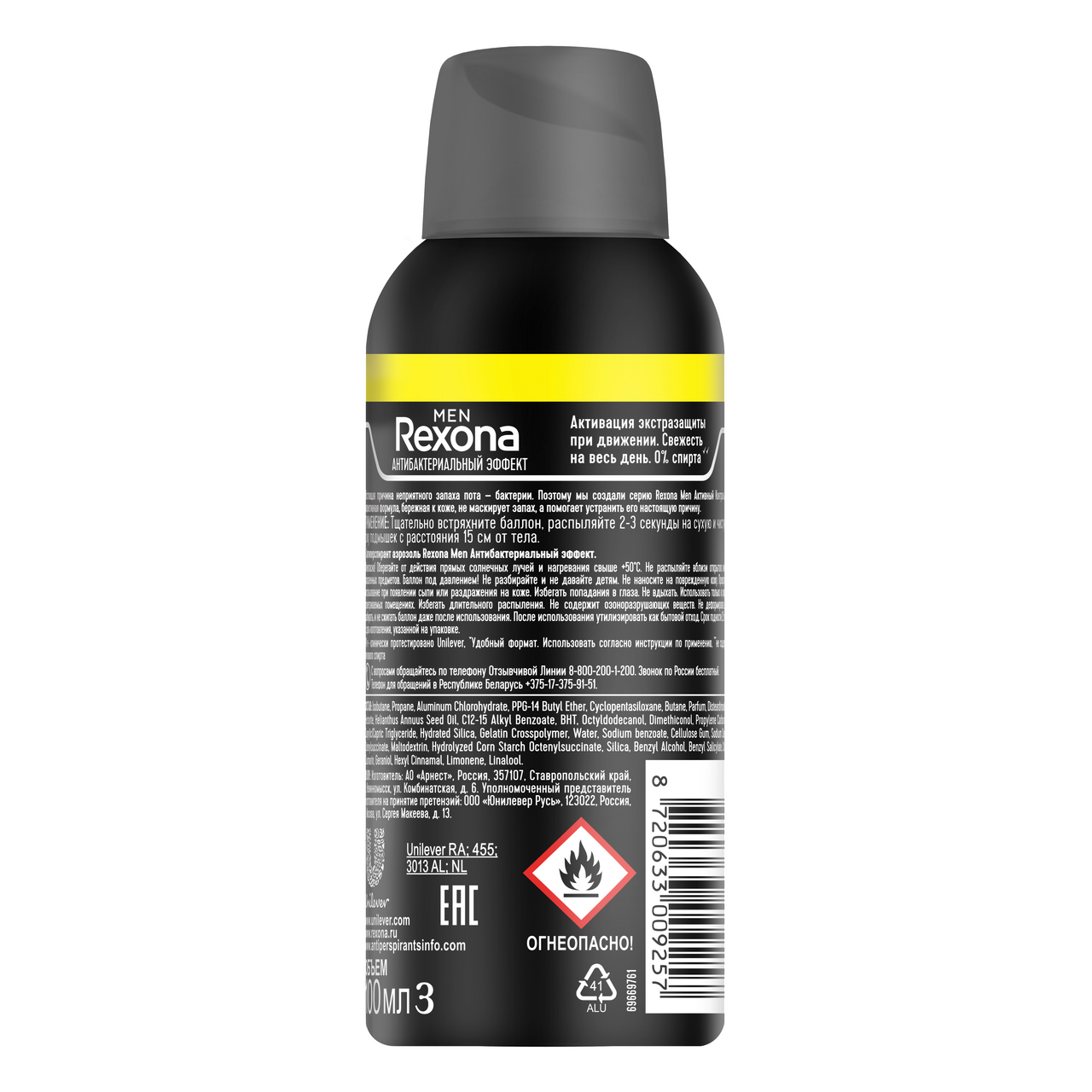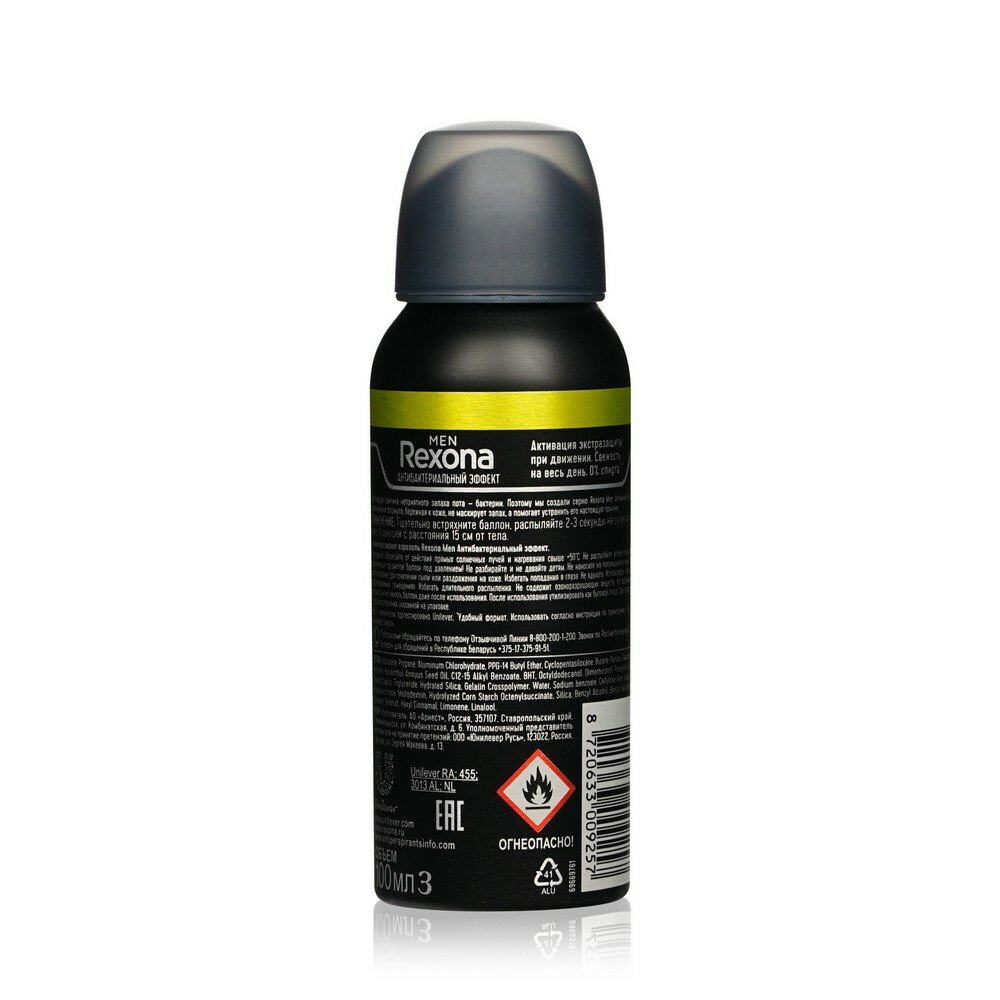 Живите насыщенной жизнью, в том темпе, который вам нравится, антиперспирант-аэрозоль Rexona Men Антибактериальный эффект надежно защитит вас от пота и запаха до 48 часов. Настоящая причина неприятного запаха пота бактерии. Эффективная формула Rexona Men Активный Контроль не маскирует запах, а помогает устранить его настоящую причину.