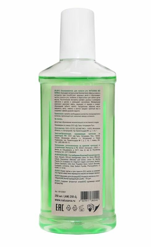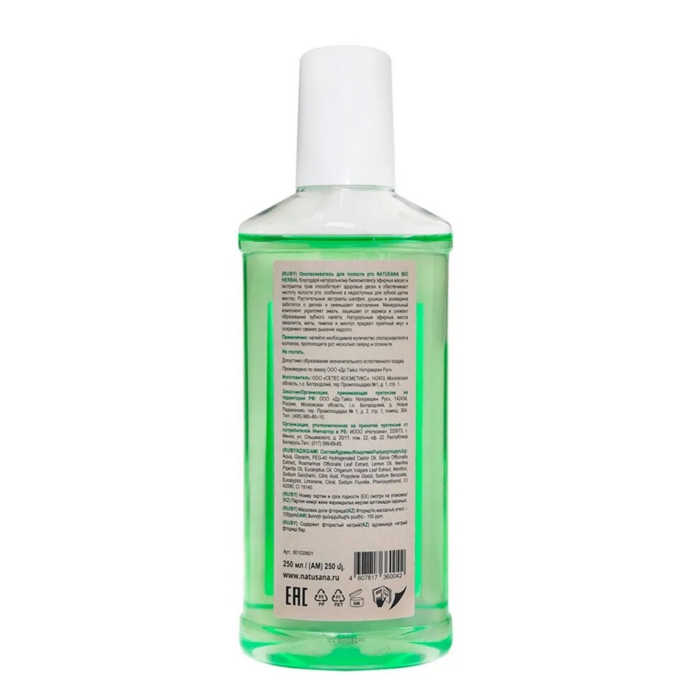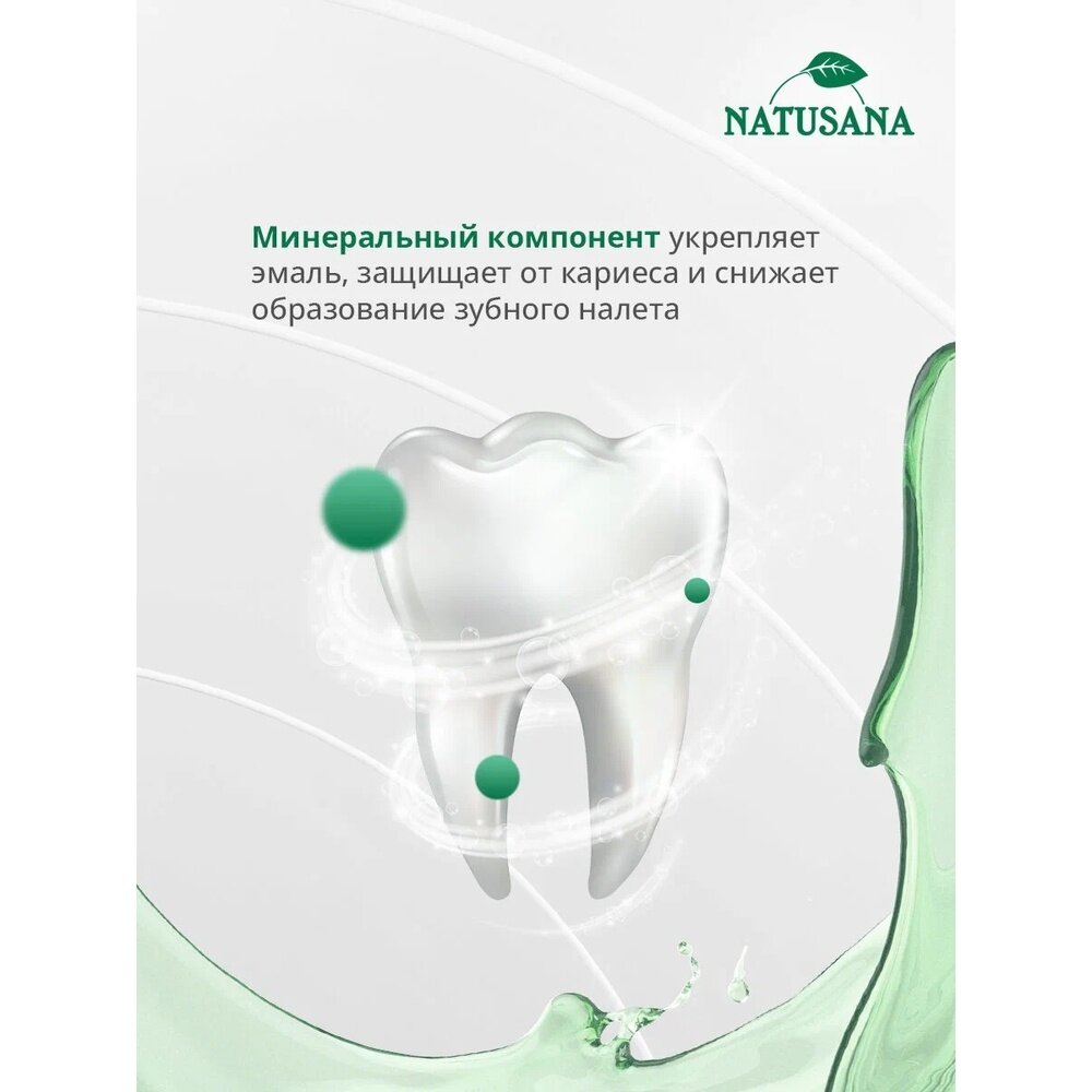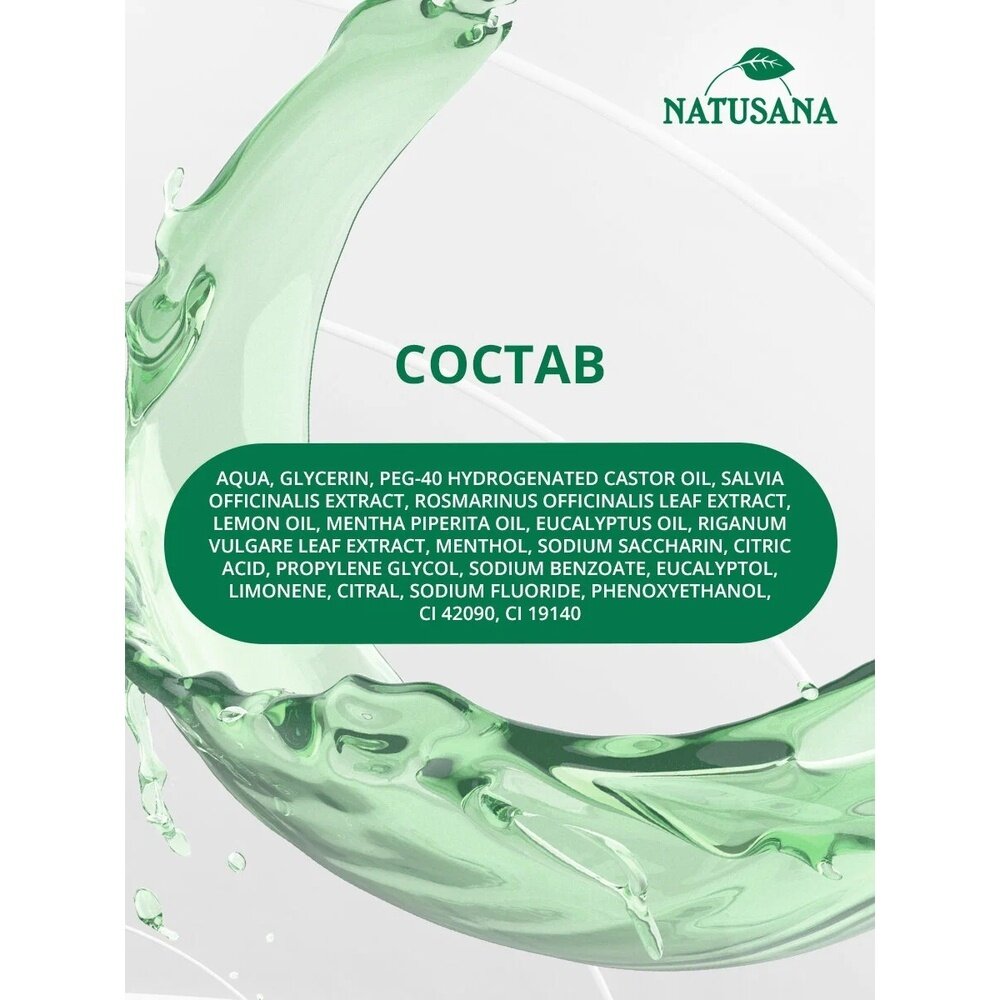 NATUSANA BIO HERBAL ополаскиватель для полости рта благодаря натуральному биокомплексу эфирных масел и экстрактов трав способствует здоровью десен и обеспечивает чистоту полости рта, особенно в недоступных для зубной щетки местах. Растительные экстракты шалфея, душицы и розмарина заботятся о деснах и уменьшают воспаление. Минеральный компонент укрепляет эмаль, защищает от кариеса и снижает образование зубного налета. Натуральные эфирные масла эвкалипта, мяты, лимона и ментол придают приятный вкус и сохраняют свежее дыхание надолго.