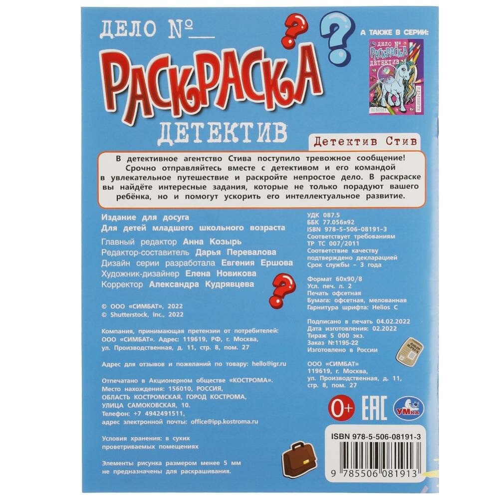 В детективное агентство Стива поступило тревожное сообщение! Маленькому художнику предстоит срочно отправиться вместе с детективом и его командой в увлекательное путешествие и раскрыть непростое дело. В раскраске ребёнок найдёт интересные задания, которые не только порадуют, но и помогут ускорить его интеллектуальное развитие.