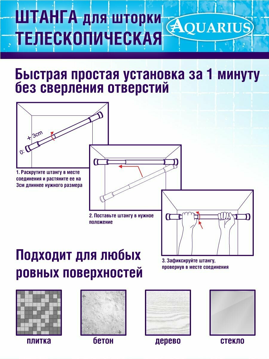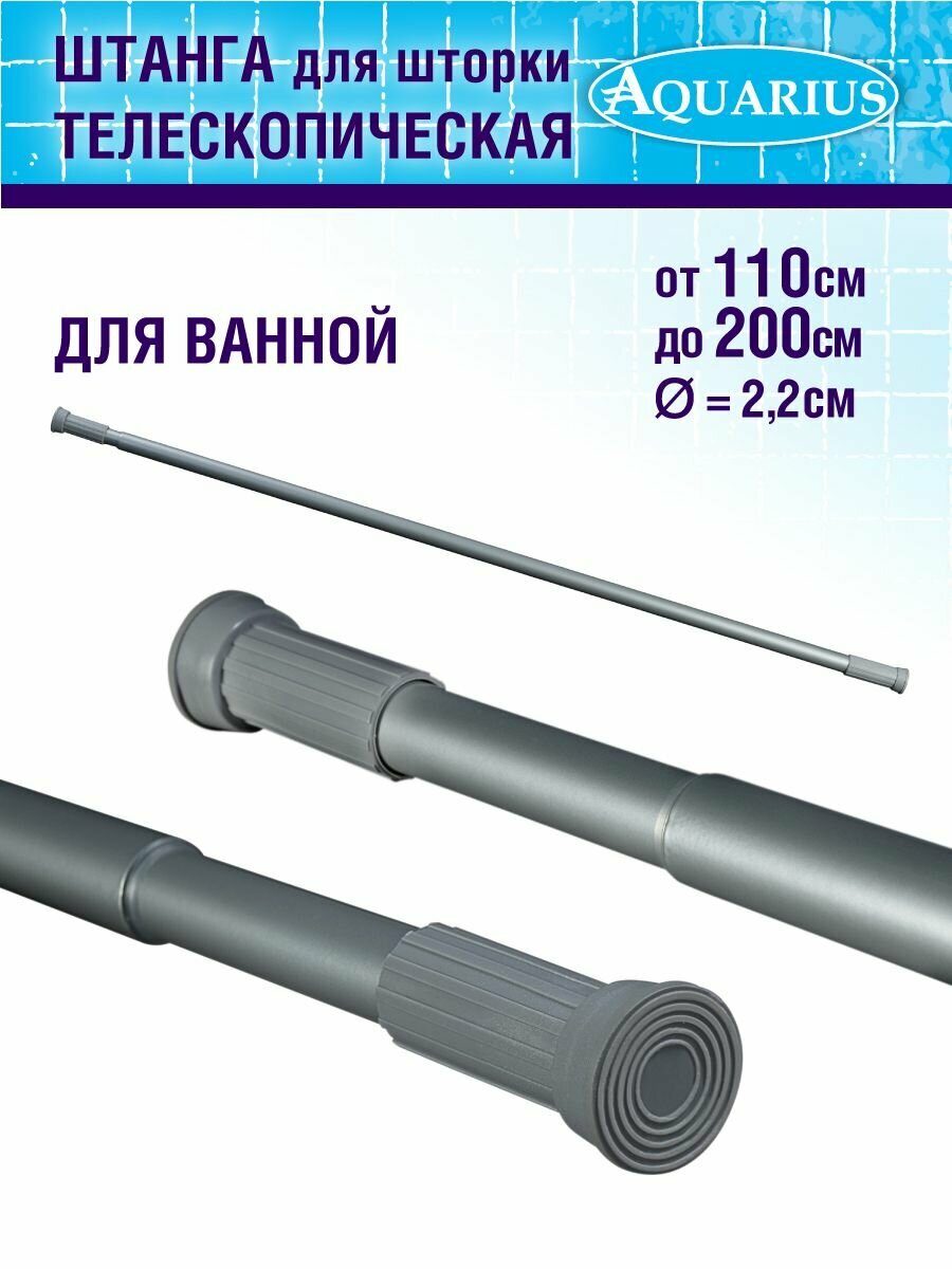 Многофункциональная телескопическая штанга для штор хромированная Aquarius диаметром 2,5 см, 110х200 см для ванных комнат и хозяйственных помещений. Вытягивается на выборочную длину от 110 до 200см. Не портит стены и мебель. Простое быстрое крепление без дополнительных усилий.