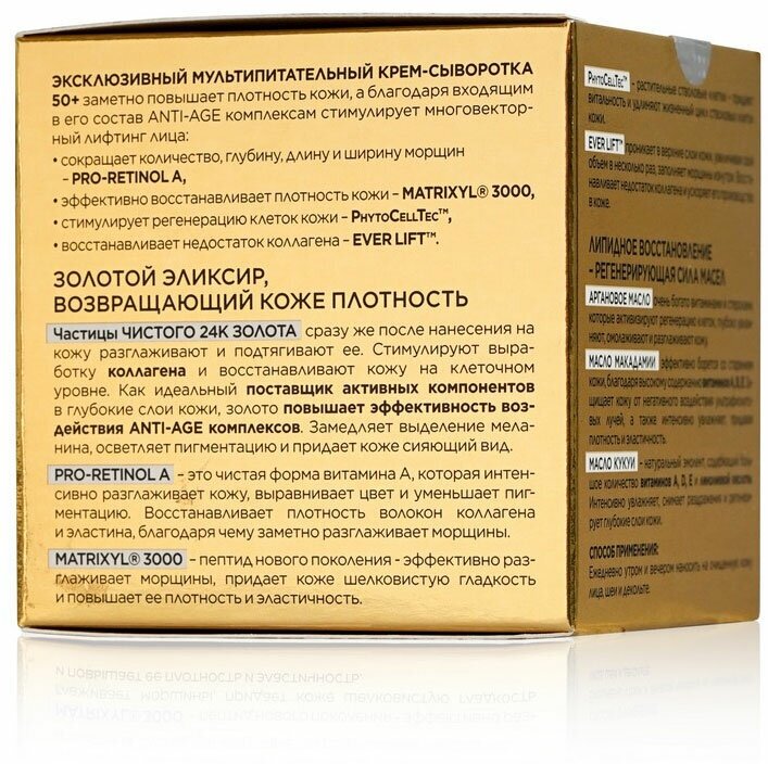 Частицы чистого 24-каратного золота разглаживают и подтягивают уже с первого нанесения. Они стимулируют интенсивный синтез коллагена и реконструкцию опорных тканей, благодаря чему омолаживают контур лица и заметно сокращают морщины. Замедляет выработку меланина, осветляет пигментацию и возвращает коже сияющий вид. ПРО-РЕТИНОЛ восстанавливает волокна коллагена и эластина и разглаживает морщины. PHYTOCELLTE растительные стволовые клетки, возвращают коже биологическую молодость. Повышают жизнеспособность клеток и стимулируют интенсивную регенерацию. COLLASURGE LQ проникает через верхние слои кожи, в несколько раз увеличивает свой объем и заполняет морщины. Аргановое масло способствует регенерации клеток и глубоко увлажняет кожу. Масло макадамии уменьшает вредное воздействие UV-излучения. Масло кукуи это натуральный смягчитель богатый витаминами A, D и E и линолевой кислотой.