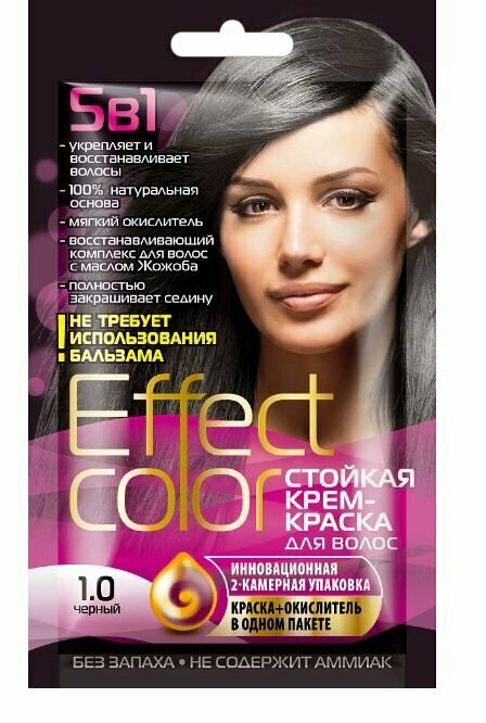 Cтойкая крем-краска для волос серии Effect Сolor 50мл, тон 1.0 черный.Способ применения: Перед использованием краски рекомендуется провести тест на чувствительность кожи. Наденьте перчатки. В неметаллическую посуду выдавите все содержимое пакета, тщательно перемешайте. Нанесите смесь на сухие волосы, начиная от корней, тщательнот пропитав каждую прядь. Время выдержки: при первичном окрашивании 30-40 мин, при повторном 25-30 мин. Промойте волосы большим количеством воды.
