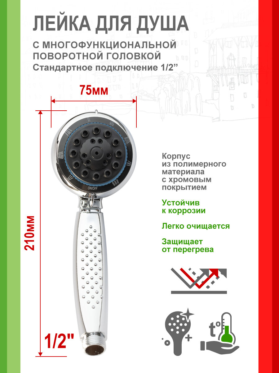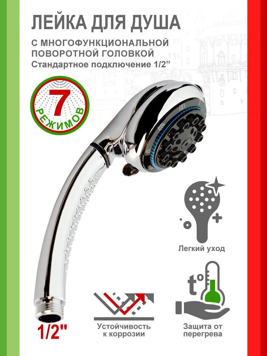 Лейка для душа с многофункциональнорй поворотной головкой. Поверхность защищена от чрезмерного нагрева. Известковые осадки легко удаляются.