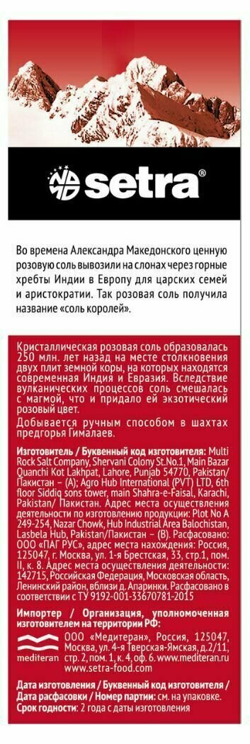 Как и тысячи лет назад, добывается ручным способом в шахтах предгорья Гималаев. Соль имеет естественный неравномерный розовый оттенок благодаря натуральной магме, входящей в состав соли. Гималайская розовая соль Setra не содержит красители. Идеально подходит для финиша блюд и использования в мельницах. Изготовлено в Пакистане, провинция Пенджаб. Помол 3.