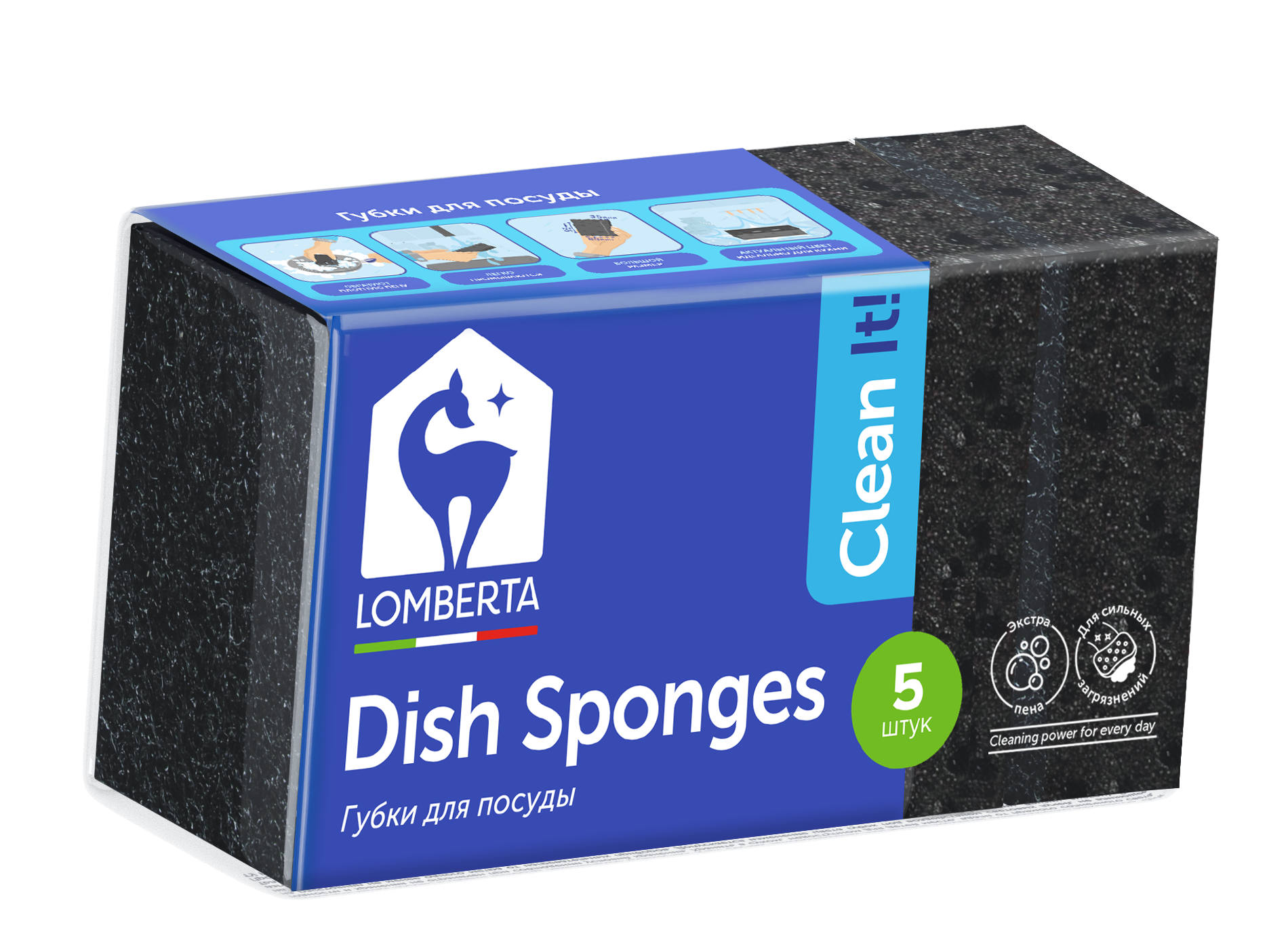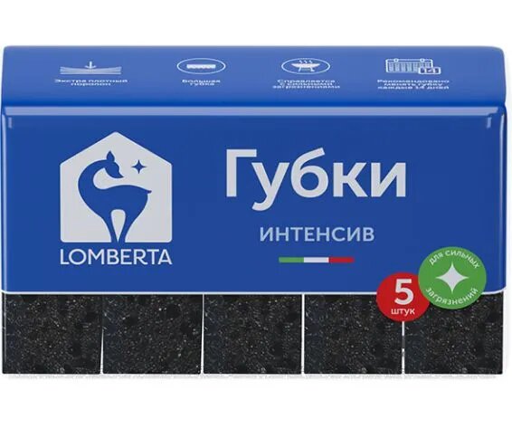 Губки для мытья посуды интенсив Lomberta (5 шт) - предназначены для мытья посуды, столовых приборов, кухонной утвари, а также подходят для чистки поверхности плит, раковин, ванн и кафеля с использованием моющих средств и без них. Слой из поролона для деликатных поверхностей, а слой повышенной жесткости для удаления стойких загрязнений. Компоненты и красители губок безопасны для здоровья, производятся в Европе. Губки для посуды выполнены в премиальном черном цвете.