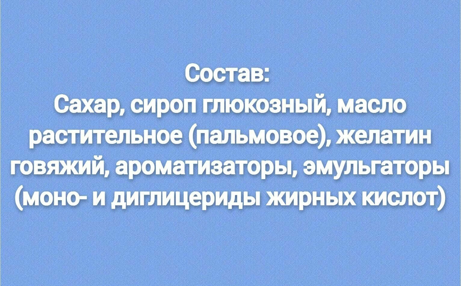 | Состав | Сахар, сироп глюкозный, масло растительное пальмовое, желатин говяжий, ароматизаторы, эмульгаторы (моно- и диглицериды жирных кислот). |