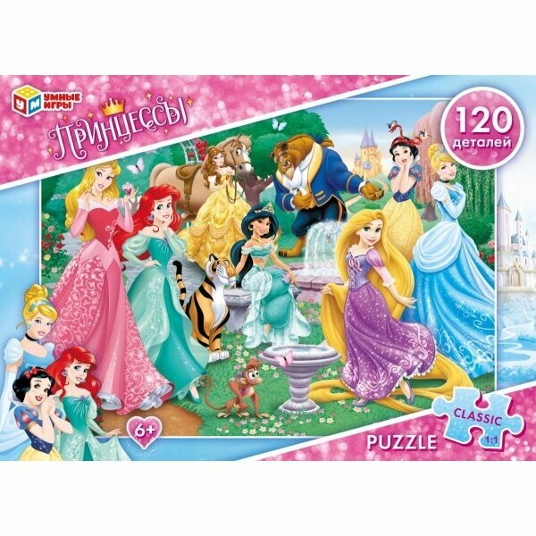 Классические пазлы в коробке "Принцессы" ТМ "Умные игры" - отличная развивающая игра для маленьких любознаек: - 120 деталей, размер готовой картинки: 225 х 165 мм, красочный дизайн, все элементы хорошо и плотно соединяются друг с другом. Задача ребенка - в правильной последовательности соединить элементы пазла и получить в результате красочную картинку с изображением прекрасных принцесс. Сборка пазлов - это очень увлекательное занятие, в процессе которого дети учатся искать и совмещать детали