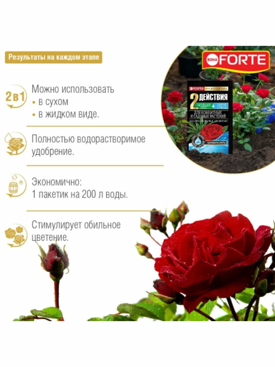 Bona Forte – водорастворимое удобрение для комнатных и садовых растений. Одного пакетика хватает на 200 литров воды. Состав стабилизирует уровень pH почвы и стимулирует обильное цветение. Удобрение можно использовать при посадке или для подкормки.