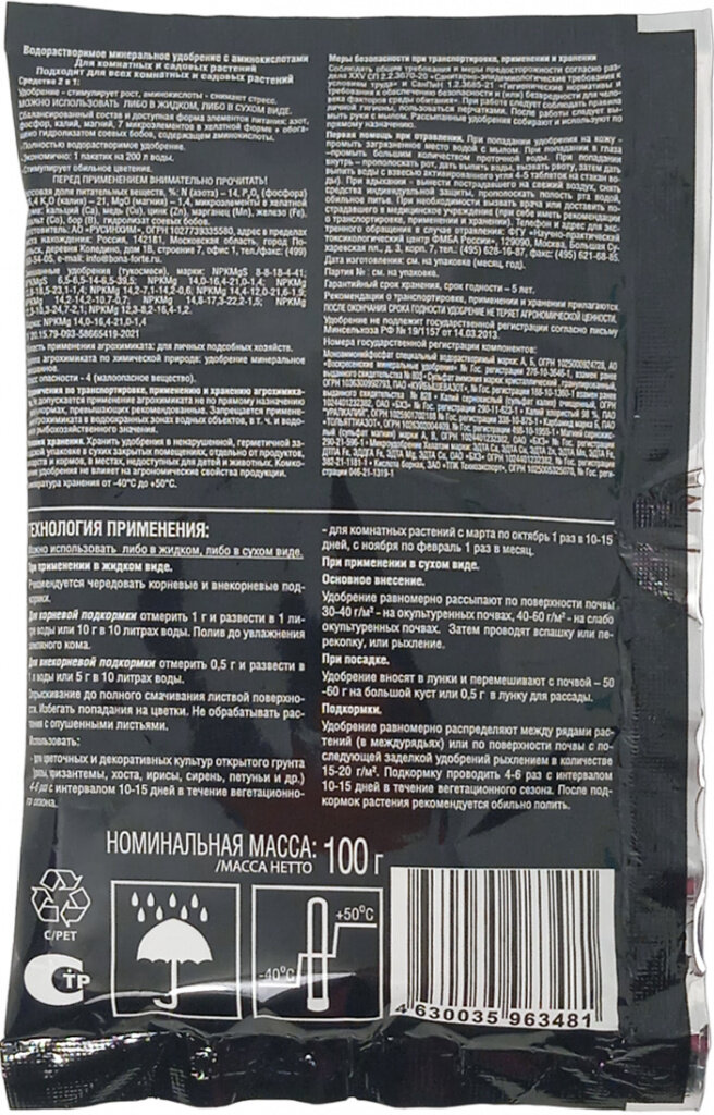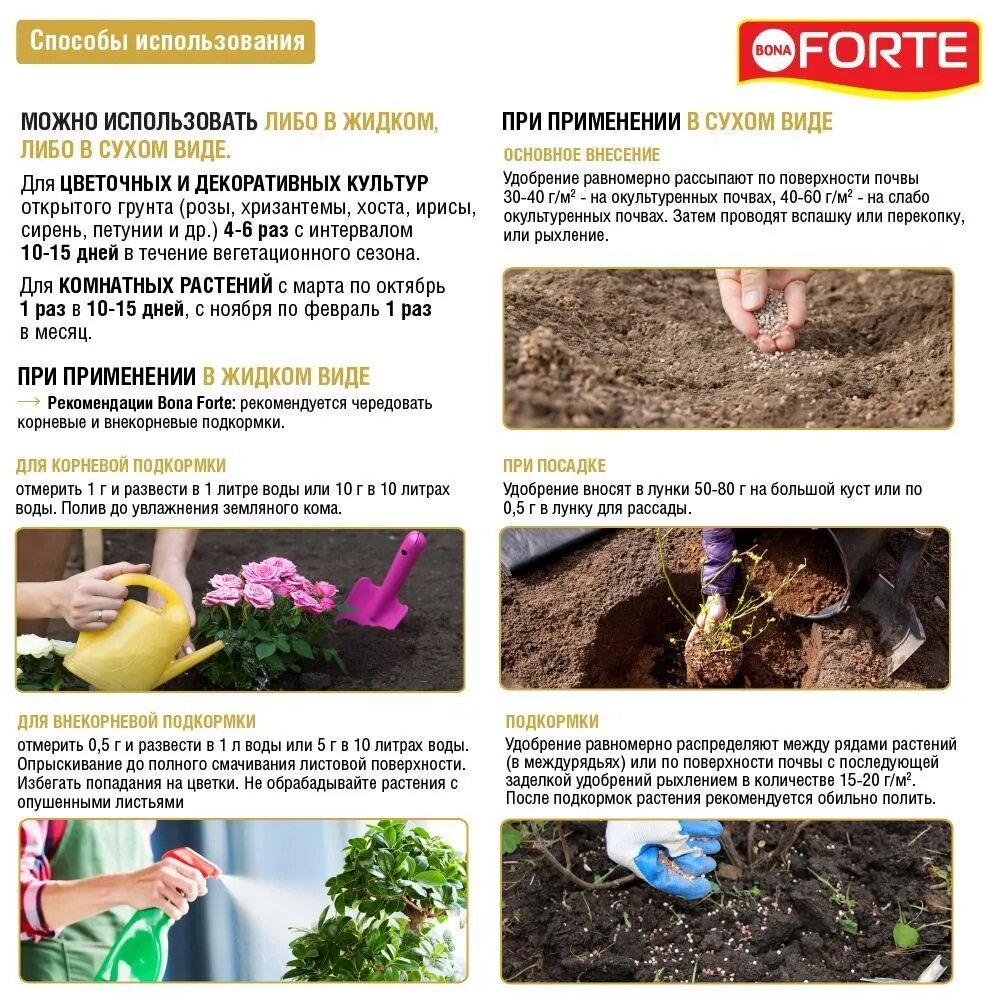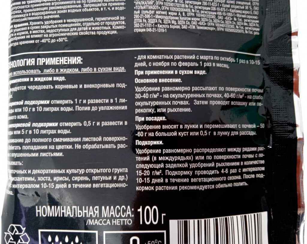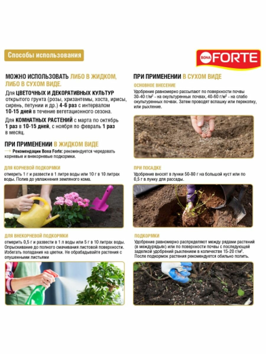 | Способ применения | Для цветочных и декоративных культур открытого грунта (розы, хризантемы, хоста, ирисы, сирень, петуньи и др.) 4-6 раз с интервалом 10-15 дней в течение вегетационного сезона. для комнатных растений с марта по октябрь 1 раз в 10-15 дней, с ноября по февраль 1 раз в месяц. |