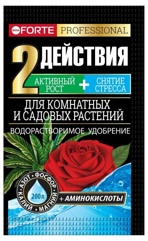 Удобрение водорастворимое c аминокислотами для комнатных и садовых растений. Подходит для всех видов комнатных и садовых растений. Полностью водорастворимое удобрение. 2 в 1 можно использовать в сухом или в жидком виде. Экономично: 1 пакетик на 200 л воды. Стимулирует обильное цветение и рост.