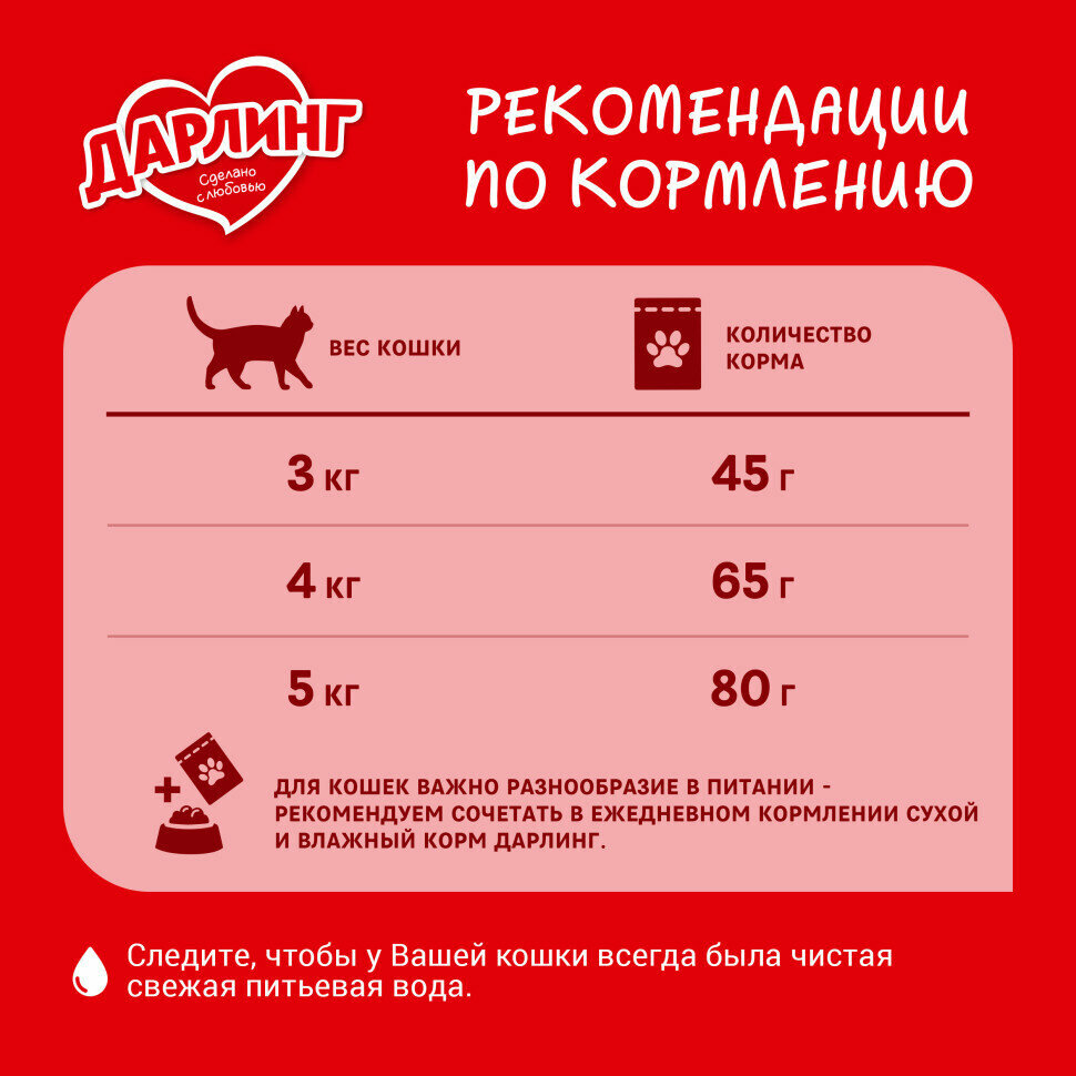 Корм Дарлинг для кошек - это сбалансированное питание, в котором содержится на 100% все, что нужно кошке каждый день. Он сделан с любовью из качественных ингредиентов, а также содержит Омега-6 жирные кислоты и витамины, необходимые Вашей кошке, чтобы быть здоровой, активной и дарить радость Вашей семье.