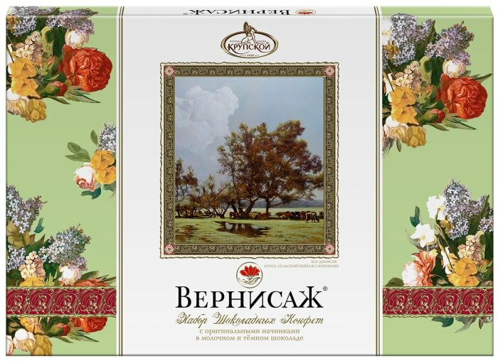 Слово Вернисаж ассоциируется у нас с красотой: красивые картины, оригинальные сюжеты, необычные формы, яркие краски. И множество посетителей, восхищающихся и восторгающихся работами мастеров. Такого же восторга и восхищения достойна коллекция шоколадных конфет Вернисаж.. Только в ней Вы найдете небывалое богатство и разнообразие вкусов, как классических, так и необычных оттенков. Набор шоколадных конфет с начинками: шоколадный крем и цукаты в темном шоколаде, сливочный крем и фисташки в молочном шоколаде.