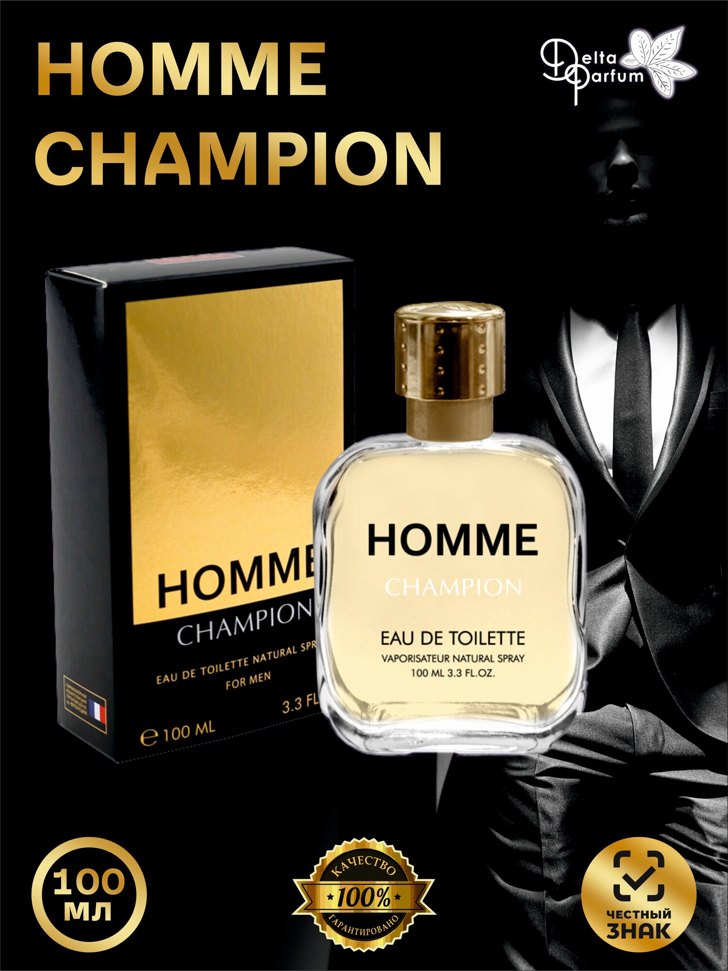 Homme Champion предназначается для мужчин, любящих шик и лоск во всем, мечтающих о богатстве и славе. Кроме того, многие успешные люди уверенны в том, что золотой цвет может способствовать открытию заветных дверей роскоши и стабильности. С первых мгновений аромат покоряет своей необычностью, так как он содержит редко используемую в парфюмерии ноту. Также запах парфюма характеризуется богатым и оригинальным сочетанием натуральных и синтетических ингредиентов, каждый их которых оказывает свое особое действие. Так, цитрусовая прохлада придает сил, заряжает бодростью, пробуждает чувства с самого раннего утра, пикантное притягательное сочетание душистых специй и ароматных трав делает парфюм немного самоуверенным и дерзким. Свежесть грейпфрута, красного мандарина и мяты добавляют радостные и искрящиеся ноты, которые являются настоящим очарованием. Утонченность, чувственность и подчеркнутую мужественность Homme Champion придают экстракт розы, пряностей и корицы. Окраска теплого древесного благоухания, сладость пачули, амбры и деликатное прикосновение кожи являются последними штрихами в общем образе аромата, они подчеркивают его уникальный стиль, элегантность наряду с изысканностью и уверенностью. Можно с уверенностью сказать, что в итоге данный парфюм состоит из целого множества ароматов, которые являются настоящим каскадом свежести и чувственности с ярким вкусовым послесловием. Парфюмеру в реальности удалось воплотить равноценную альтернативу золоту, и это аромат Homme Champion. Группа ароматов: древесные , пряные Верхние ноты: грейпфрут , красный мандарин , мята Ноты сердца: корица , пряности , роза Базовые ноты: амбра , кожа , древесные ноты , пачули из Индонезии Вся парфюмерия Delta parfum изготавливается на основе оригинальных Немецких (Drom Fragrances) композиций с соблюдением всех необходимых производственных процессов и норм качества, исключительно в заводских условиях, имеет необходимые сертификаты качества. Строгое соблюдение технологий на наших заводах с многолетней историей успешного развития- гарантирует высочайшее качество изготовления парфюмерии, а применение исключительно оригинальных Европейских ароматических композиций- позволит Вам ощутить уже известные, знакомые ароматы, но по значительно более низкой цене.