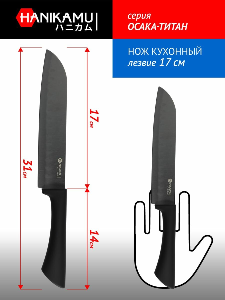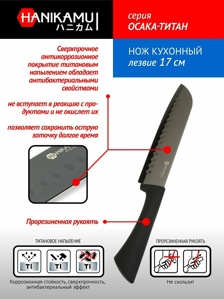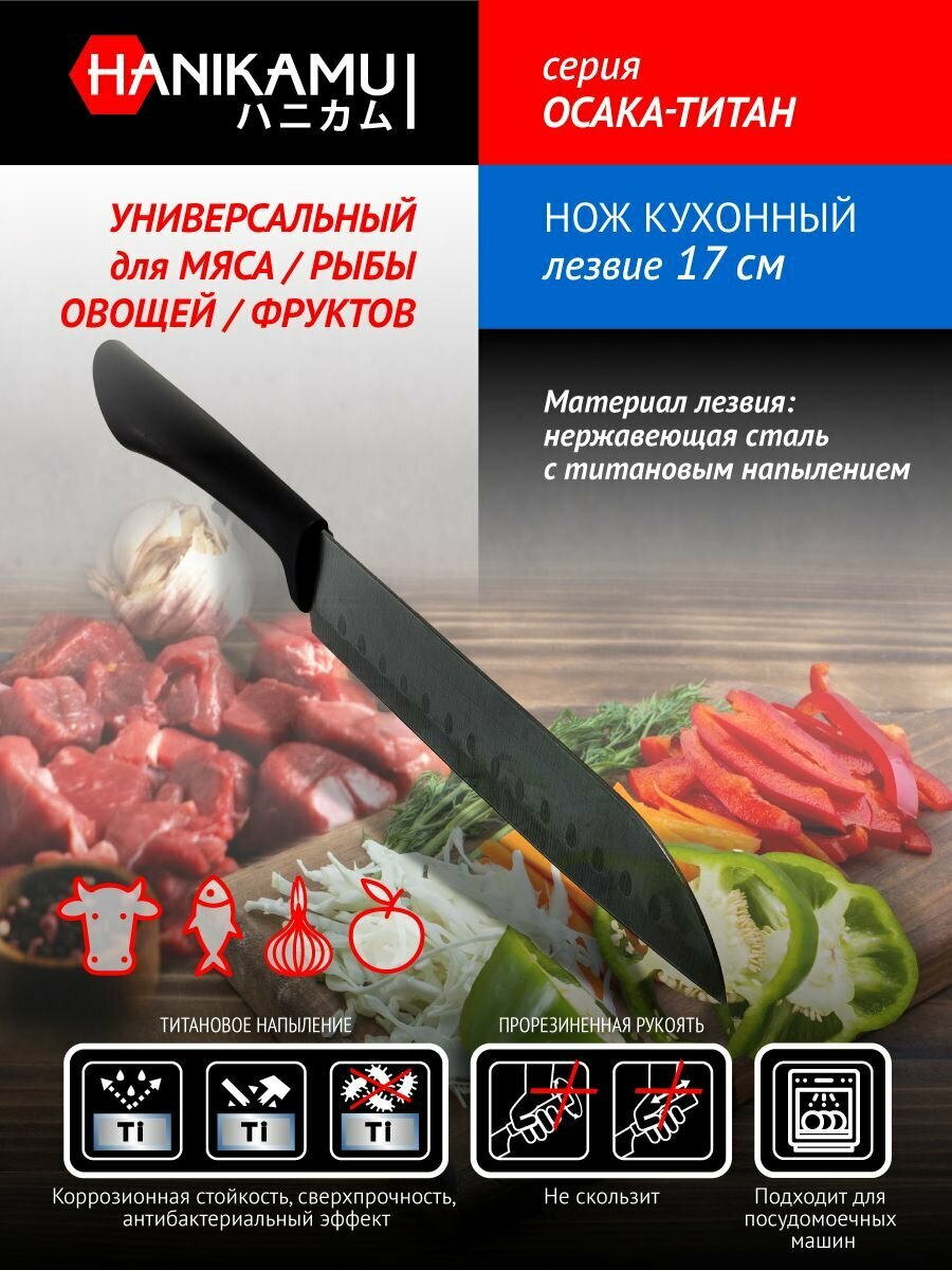 Лезвия ножей серии Осака-Титан покрыты титановым напылением, обладающим антибактериальными свойствами, не вступающим в реакцию с продуктами и не окисляя их. Сверхпрочное титановое покрытие лезвия позволяет сохранить острую заточку долгое время. Нож Сантоку - универсальный японский нож. Подходит для мяса, рыбы и овощей. Предназначен для нарезки кубиками, ломтиками, соломкой, полукольцами. «Воздушные карманы» на лезвии ножа облегчают нарезку и отделение нарезаемого продукта от поверхности лезвия. Широкое лезвие из нержавеющей стали с высоким содержанием углерода и хрома обладает повышенной жесткостью и антикоррозийностью. Прорезиненная рукоять. Отличная балансировка.