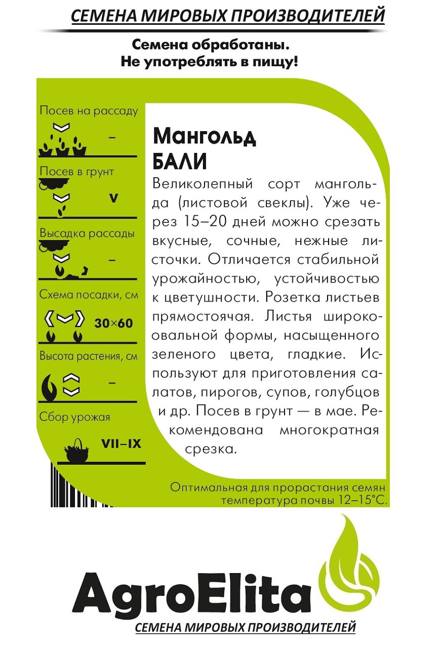 Великолепный сорт мангольда (листовой свеклы). Уже через 15-20 дней можно срезать вкусные, сочные, нежные листочки. Отличается стабильной урожайностью, устойчивостью к цветушности. Розетка листьев прямостоячая. Листья широкоовальной формы, насыщенного зеленого цвета, гладкие. Используют для приготовления салатов, пирогов, супов, голубцов и др. Посев в грунт в мае. Рекомендована многократная срезка.