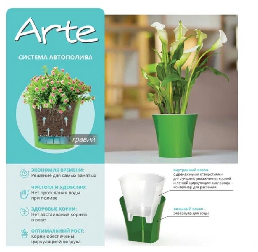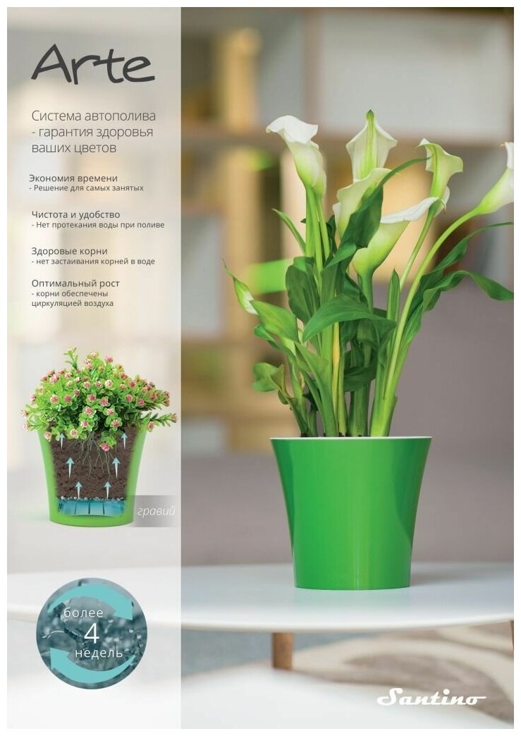 Классика это то, что по душе несмотря на моду и время, позитив и целеустремленность. Именно такие девизы характеризуют вазоны серии Santino "Арте". Её прочность, правильные пропорции идеально подходят к комнатным растениям любых расцветок и форм.Вазон Santino "Арте" оснащен прочной и проверенной временем системой автополива с отделяющимся дном, оросительным механизмом и указателем количества воды для точного контроля за увлажнением. Благодаря современной разработке, механизм автополива Santino забираете на себя работу по уходу за вашими комнатными цветами на протяжении 4 недель, в зависимости от величины кашпо, места размещения цветка и его личных свойств. В поездке вы либо трудитесь далеко от вашей квартиры, домашние цветочки получают достаточное количество воды для стабильного роста и размножения, также полезные вещества природным для себя способом. Уникальные вазоны из пластика, благодаря огромной гамме цветов и специальному покрытию впишутся в любой дизайн. Изготовляются из высокопрочного пластика, сделанного из качественного сырья, выдерживают удары и падения с небольшой высоты, не реагируют на солнечные лучи и минусовую температуру. С кашпо Santino Вы сможете наслаждаться красотой комнатных цветов, не затрачивая огромного количества времени. Поэтому, цветочные вазоны Santino выглядят, как современные горшки, но при этом каждую минуту сохраняют ваши цветы, в то время как вы трудитесь, или путешествуете далеко от дома.