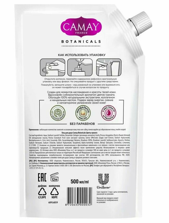 Гель для душа Camay Botanicals с коллагеном и миндальным маслом 500 мл