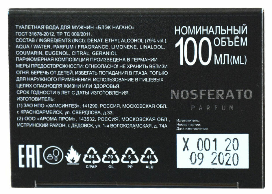Туалетная вода Nosferato Black Nagano относится к группе древесные, фужерные. Верхние ноты — конопля, зеленые ноты. В сердце — смола, древесные ноты, табак, кофе. В шлейфе — уд и ладан. Способ применения: распылить на кожу с расстояния 10–15 сантиметров.