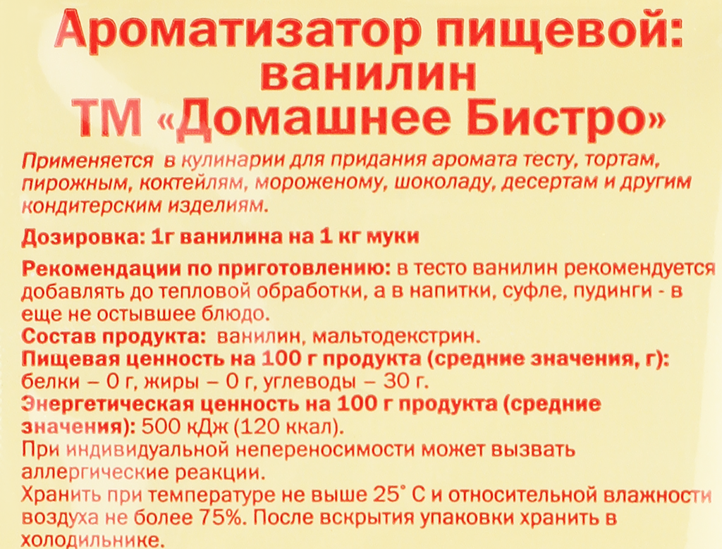 Добавка ароматическая ванилин пищевой применяется для добавки в тесто, торты, пирожные, коктейли, мороженое, шоколад, десерты и другие кондитерские изделия с целью придания аромата ванили. Дозировка: 0,1 - 0,3 г ванилина (на кончике ножа) на 1 кг муки. Рекомендации: перед добавлением в блюдо ванилин рекомендуется развести в теплой воде в пропорции 1:20 или смешать с сахаром в пропорции 1:10. Вносить в блюдо в порошке нельзя. В тесто ванилин рекомендуется добавлять до тепловой обработки, а в напитки, суфле, пудинги - в еще не остывшее блюдо.