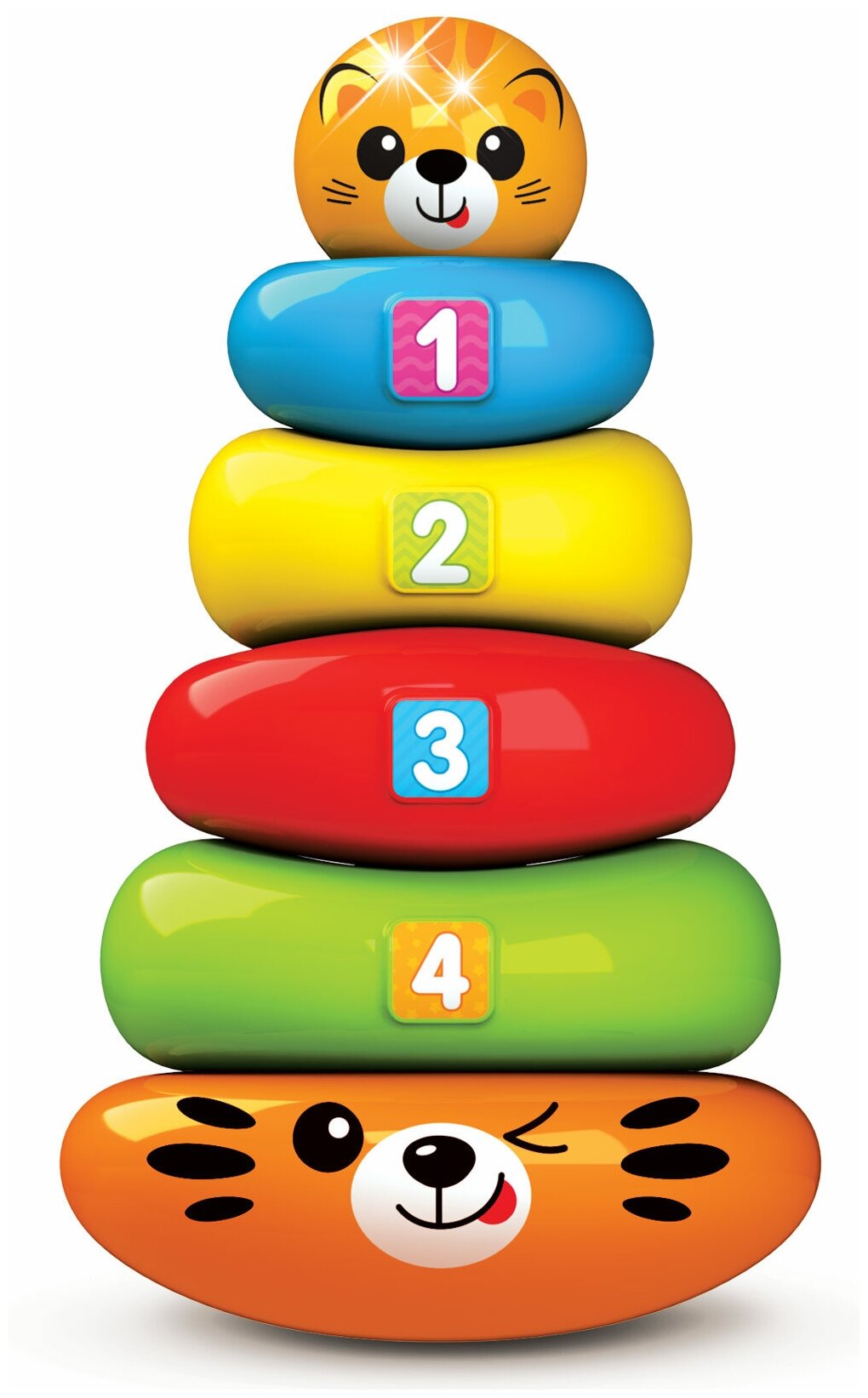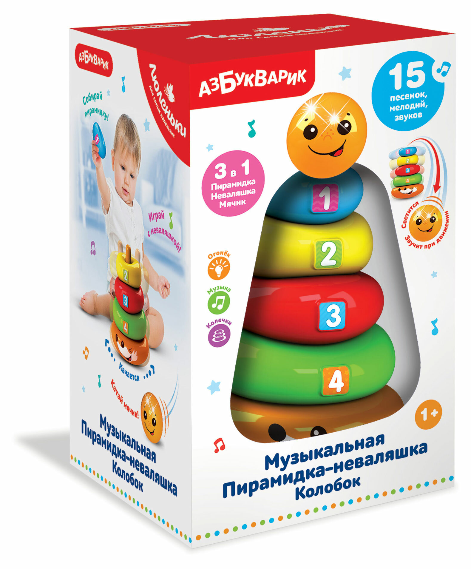 Музыкальная игрушка 3 в 1: пирамидка, неваляшка и мячик! Собери пирамидку из разноцветных колечек, а на вершину положи мячик! Собрал пирамидку? Поиграй с ней, как с неваляшкой она качается в разные стороны. Катай мячик он звучит при движении! Слушай веселые песенки и мелодии, забавные звуки. Огоньки на мячике мигают под музыку и дарят отличное настроение. Игрушка отлично подходит для малышей от 1 года. Колечки разного цвета и размера развивают логическое мышление, песенки и звуки развивают слуховое восприятие, игры с мячиком и неваляшкой стимулируют двигательную активность и мелкую моторику.