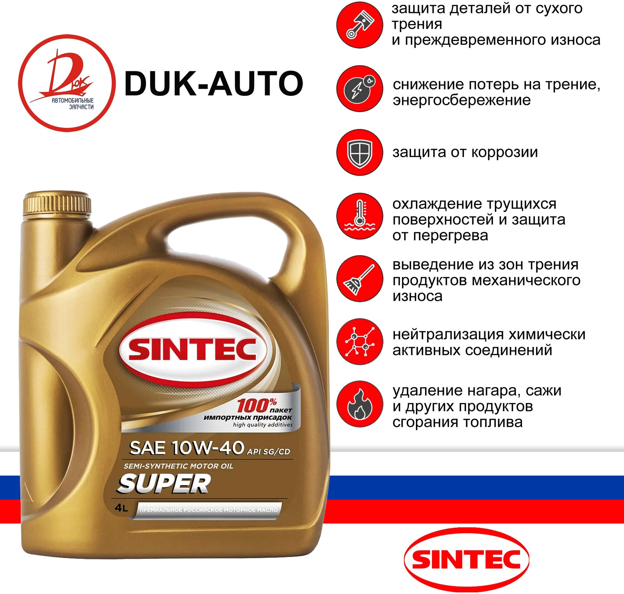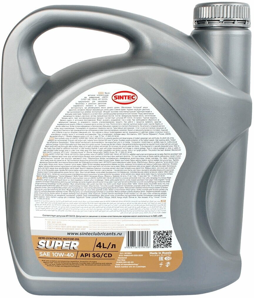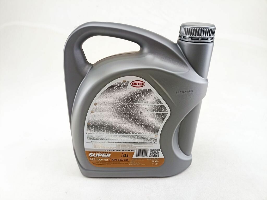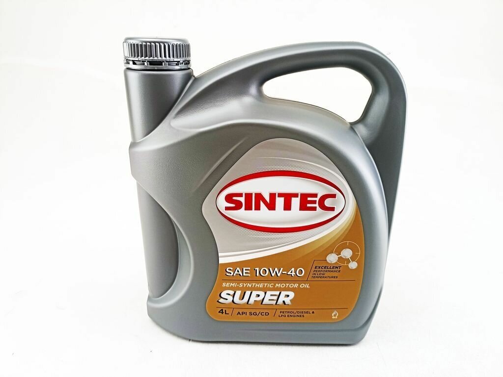 Полусинтетическое моторное масло SINTEC SUPER 10W-40 производится с использованием высокоочищенных базовых масел и сбалансированного пакета присадок. Предназначено для применения в бензиновых и дизельных двигателях современных легковых и грузовых автомобилей отечественного и зарубежного производства. Обладает увеличенным сроком службы, сниженным расходом масла на угар и улучшенными антикоррозионными свойствами.