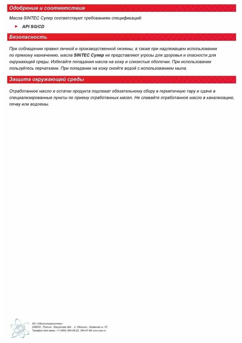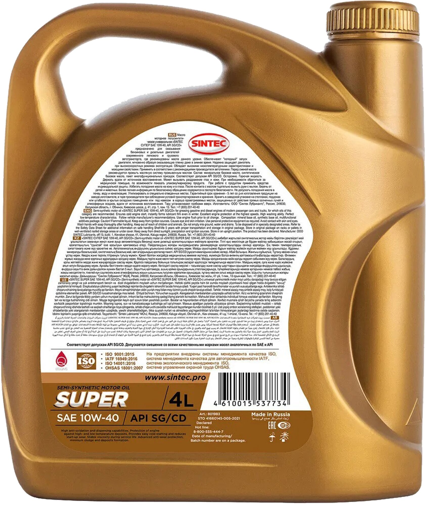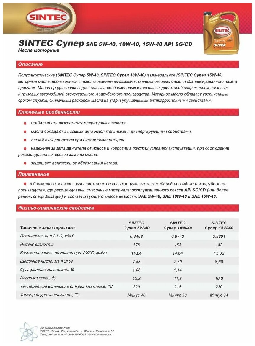 Полусинтетическое моторное масло SINTEC SUPER 10W-40 производится с использованием высокоочищенных базовых масел и сбалансированного пакета присадок. Предназначено для применения в бензиновых и дизельных двигателях современных легковых и грузовых автомобилей отечественного и зарубежного производства. Обладает увеличенным сроком службы, сниженным расходом масла на угар и улучшенными антикоррозионными свойствами.