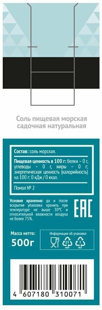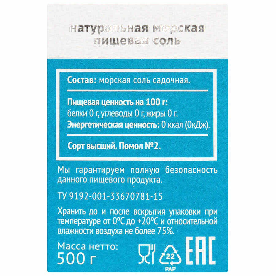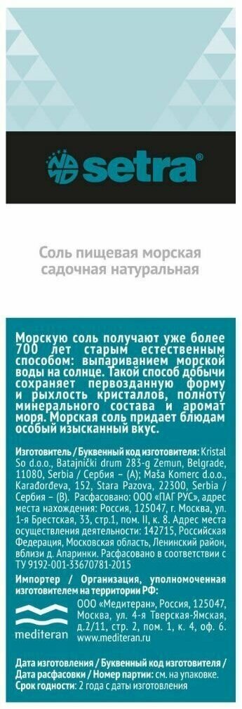 Морскую соль получают уже более 700 лет традиционным способом выпариванием морской воды на солнце, что позволяет сохранить первозданную форму и рыхлость кристаллов, полноту минерального состава и аромат моря. Натуральная морская соль Setra естественно обогащена минералами, не содержит добавок. Крупные кристаллы идеально подходят для использования в мельницах, а также при приготовлении мяса и рыбы. Помол 2.