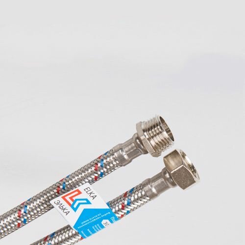 Комплект из двух гибких подводок в оплетке из нержавеющей стали ELKA 1/2"хМ10х50, с коротким и длинным хвостовиком (М10) предназначен для подключения смесителя к трубопроводам системы горячего и холодного водоснабжения.