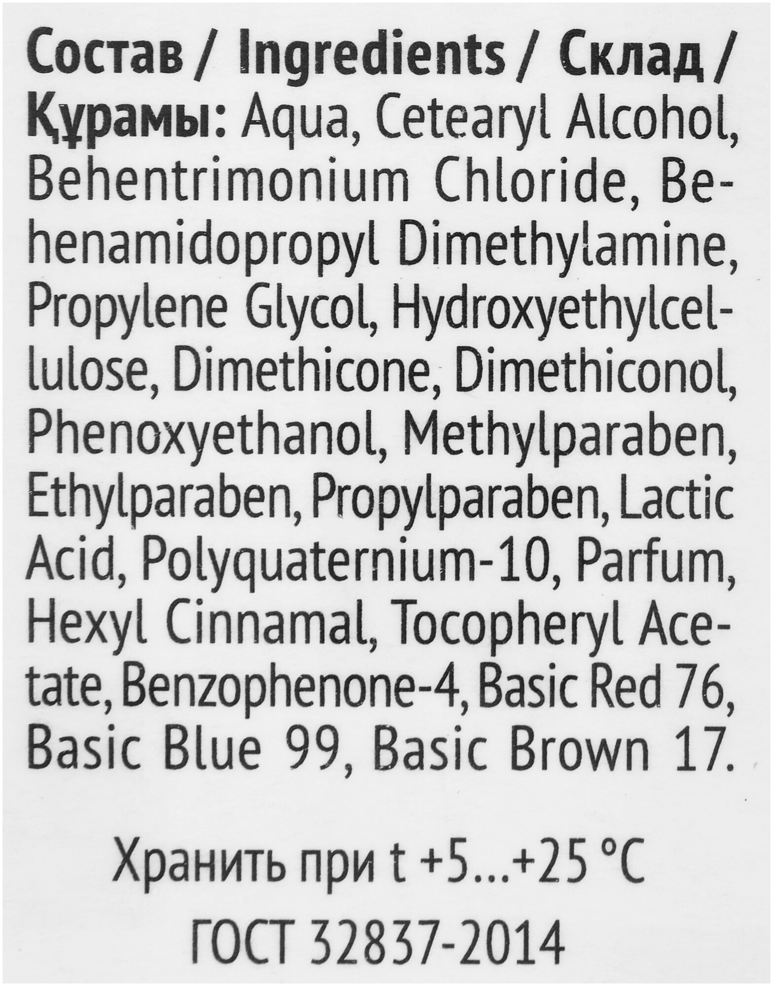 | Состав | Aqua, Cetearyl Alcohol, Behentrimonium Chloride, Behenamidopropyl Dimethylamine, Propylene Glycol, Hydroxyethylcellulose, Dimethicone, Dimethiconol, Phenoxyethanol, Methylparaben, Ethylparaben, Propylparaben, Lactic Acid, Polyquaternium-10, Parfum, Hexyl Cinnamal, Tocopheryl Acetate, Benzophenone-4, Basic Red 76, Basic Blue 99, Basic Brown 17. |