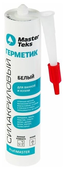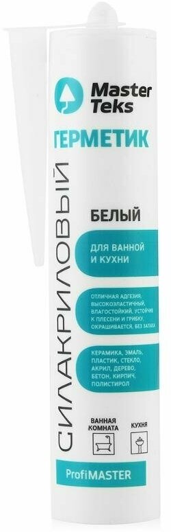 Герметик Profmaster силакриловый для ванной и кухни Masterteks. Высококачественный однокомпонентный пластоэластичный силакриловый герметик с противоплесневыми и противогрибковыми добавками. Преимущества: - Отличная адгезия к большинству гладких и пористых материалов (стекло, керамика, эмаль, ПВХ, полистирол, поликарбонат, пробка, дерево, кирпич, бетон, штукатурка и др. ); - Высокая эластичность после отверждения; - Возможность нанесения нескольких слоев после отверждения; - Содержит фунгицид, препятствующий гниению, образованию грибка и плесени; - Можно окрашивать любыми видами красок; - Без запаха, экологичен, не токсичен, безопасен.