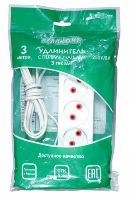Сервис сравнения цен СкидкаГИД предлагает сравнить цены на товар «Удлинитель Веллконт с переключателем 3вх без заземления 3 м»