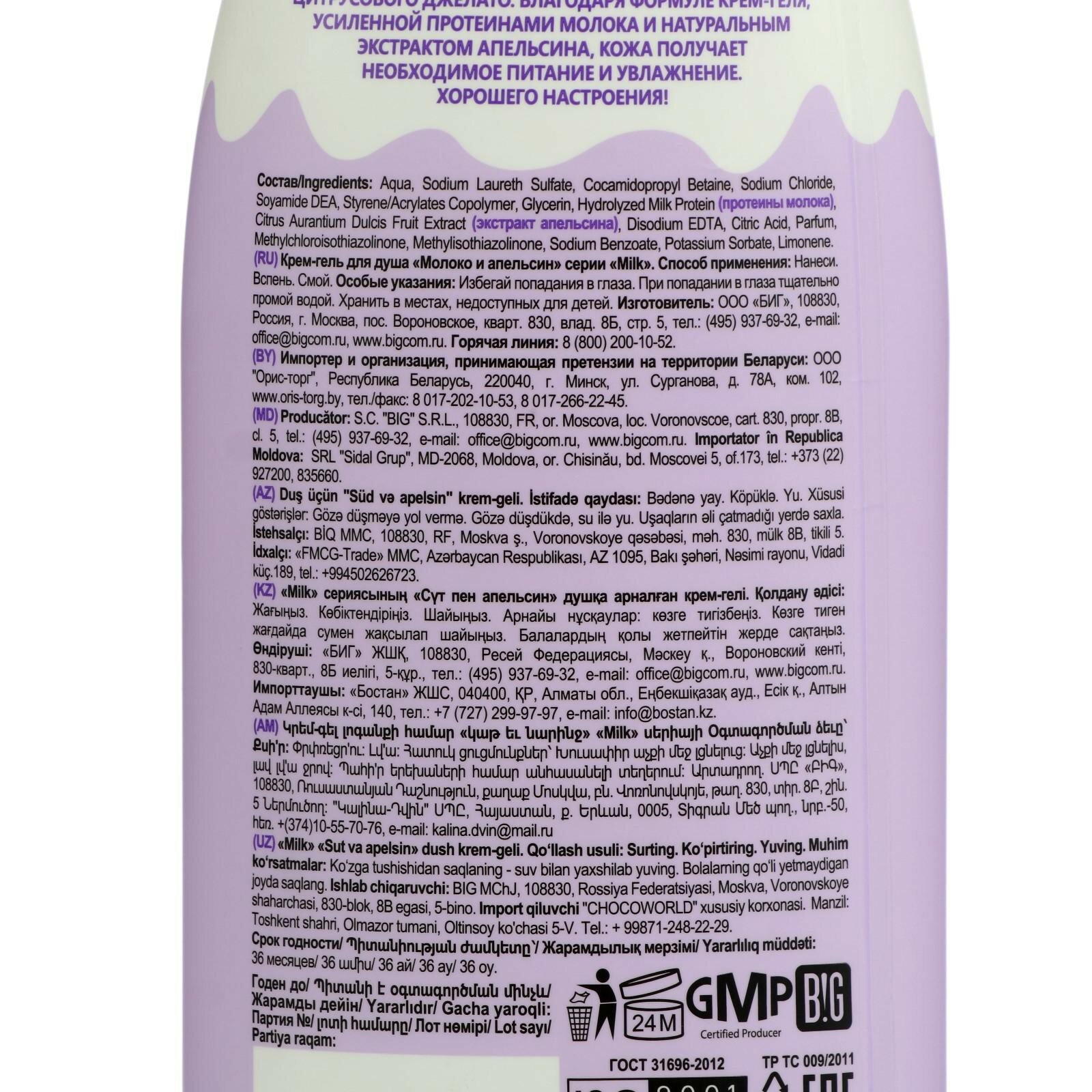 | Химический состав | Aqua, Sodium Laureth Sulfate, Cocamidopropyl Betaine, Sodium Chloride, Cocamide DEA, Styrene/Acrylates Copolymer, Hydrolyzed Milk Protein (протеины молока), Propylene Glycol, Сitrus Aurantium Dulcis Fruit Extract (экстракт апельсина), Disodium EDTA, Citric Acid, Parfum, Methylchlоroisothiazolinone, Мethylisothiazolinone, Limonene, Benzyl Alcohol., |