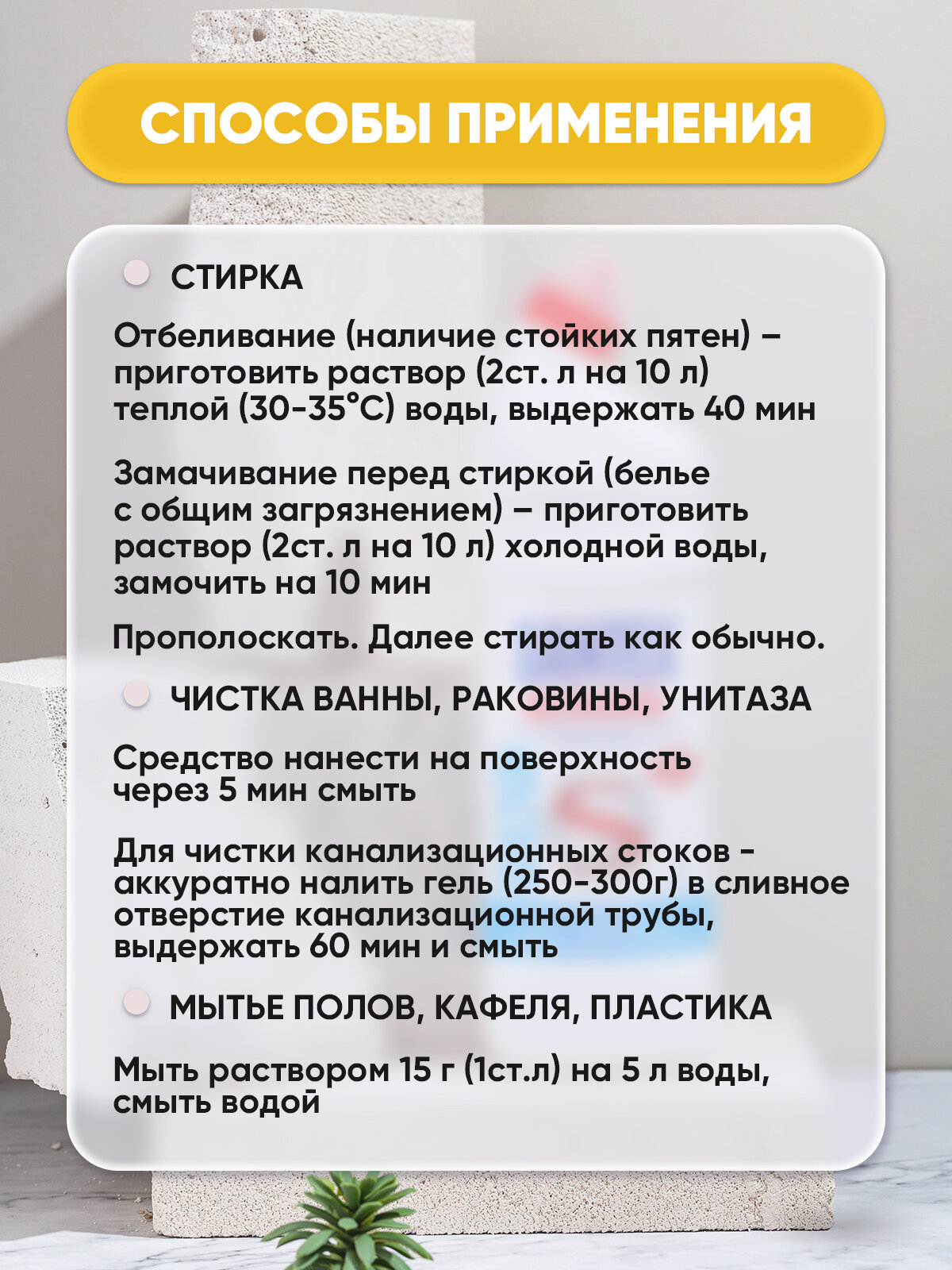 Прекрасно отбеливает, удаляет пятна, чистит кафельные, фаянсовые и пластиковые поверхности, дезинфицирует. Может использоваться для отбеливания белых хлопчатобумажных тканей, в разбавленном виде прекрасно подходит для мытья и дезинфекции полов. Устраняет неприятные запахи, в том числе при чистке лотков домашних животных. Борется с плесенью, убивает микробы.