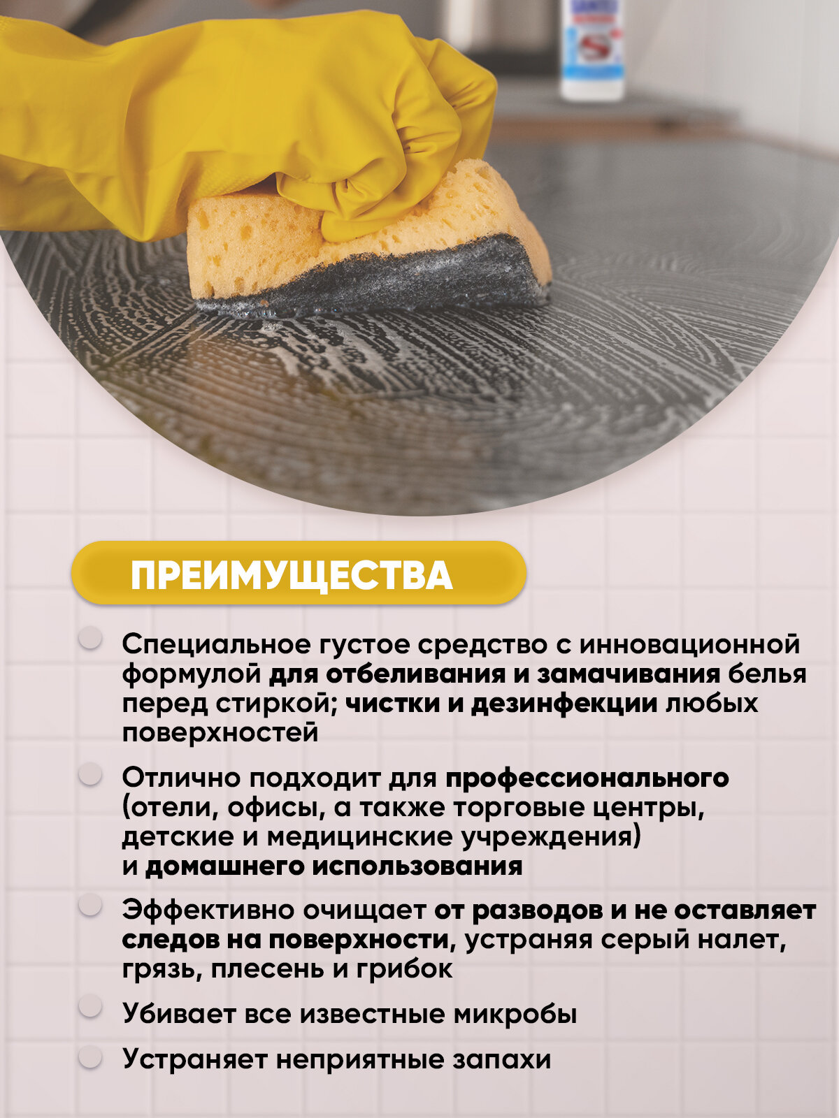 | Состав | Гипохлорит натрия (хлор), смесь ПАВ, Натр едкий (щёлочь) |