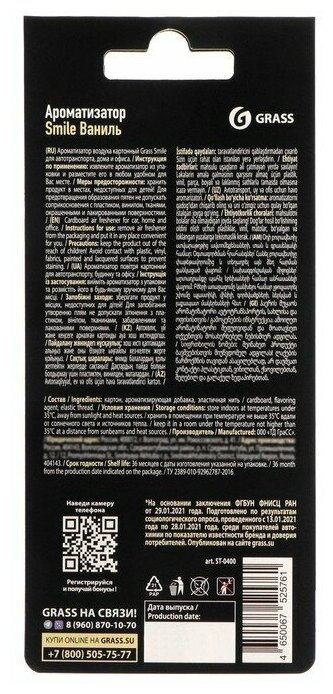 GRASS Картонный ароматизатор воздуха ваниль для автотранспорта, дома и офиса. Эксклюзивная серия ароматизаторов от компании GRASS. Каждая композиция разработана и подобрана совместно с профессиональными парфюмерами и имеет роскошный долгоиграющий аромат, который придется по душе самым искушенным ценителям. Инструкция по применению: Извлеките ароматизатор из упаковки и разместите его в любом удобном для вас месте. Меры предосторожности: Хранить в местах, недоступных для детей. Для протвращения образования пятен не допускать соприкосновения с пластиком, винилом, тканями, окрашенными и лакированными поверхностями. Состав: картон, ароматизирующая добавка, эластичная нить.