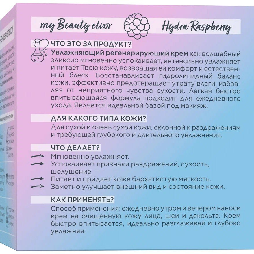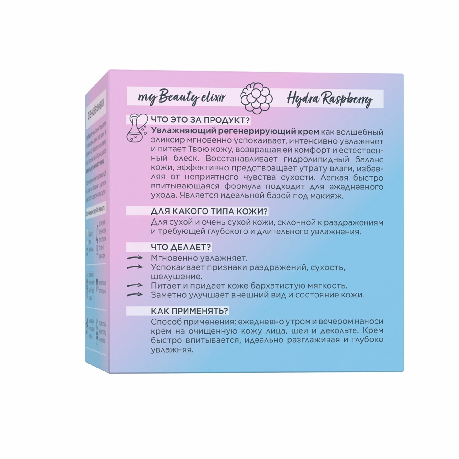 Увлажняющий регенерирующий крем как волшебный эликсир мгновенно успокаивает, интенсивно увлажняет и питает Твою кожу, возвращая ей комфорт и естественный блеск. Восстанавливает гидролипидный баланс кожи, эффективно предотвращает утрату влаги, избавляя от неприятного чувства сухости. Ниацинамид сужает поры, устраняет покраснения и другие несовершенства кожи. Малина интенсивно увлажняет и освежает кожу, укрепляет гидролипидный барьер эпидермиса. Пробиотики восстанавливают и питают уникальную микрофлору кожи. Гиалуроновая кислота глубоко увлажняет, ревитализирует эпидермис. Комбучка улучшает цвет лица, выравнивает рельеф кожи, оказывает детокс-эффект.