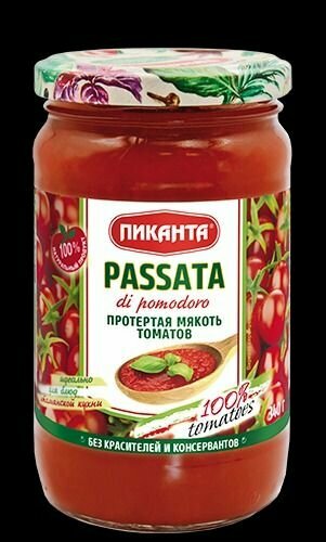 PASSATA di pomodoro протертая мякоть томатов. Это 100% натуральный продукт без красителей и консервантов, состоящий из переработанных спелых томатов. Консистенция равномерная, мелкозернистая, соответствует протертой мякоти томатов. С добавлением незначительного количества соли и сахара для достижения идеального вкусового баланса. Этот традиционный итальянский соус создан специально для приготовления блюд итальянской кухни, таких как пицца, паста, лазанья, супы Минестроне и томатные супы пюре. Также его можно использовать как основу для приготовления томатного сока.
