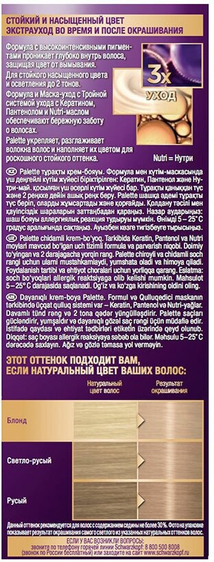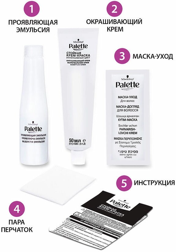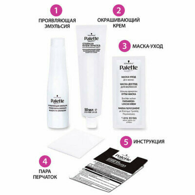 Формула с высокоинтенсивными пигментами проникает глубоко внутрь волоса, защищая цвет от вымывания. Стойкий насыщенный цвет надолго и 100 % закрашивание седины. Формула и Маска-уход с Тройной системой ухода с Кератином, Пантенолом и Nutri-маслом обеспечивают бережную заботу о волосах. Palette укрепляет, разглаживает волокна волос и наполняет их цветом для роскошного стойкого оттенка. * Nutri = Нутри Защита от вымывания цвета. Экстрауход во время и после окрашивания. 100% закрашивание седины.