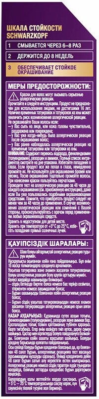 | Химический состав | Окрашивающий крем: aqua, cetearyl alcohol, ammonium hydroxide, glyceryl stearate, ceteareth-20, octyldodecanol, sodium laureth sulfate, sodium cetearyl sulfate, serine, simmondsia chinensis seed oil, parfum, oleic acid, potassium stearate, glycerin, tetrasodium edta, carbomer, potassium hydroxide, ascorbic acid, linoleamidopropyl pg-dimonium chloride phosphate, propylene glycol, sodium sulfate, проявляющая эмульсия: aqua, paraffinum liquidum, hydrogen peroxide, cetearyl alcohol, peg-40 castor oil, sodium cetearyl sulfate, etidronic acid, potassium hydroxide, 2,6-dicarboxypyridine, disodium pyrophosphate, sodium benzoate. Кондиционер |