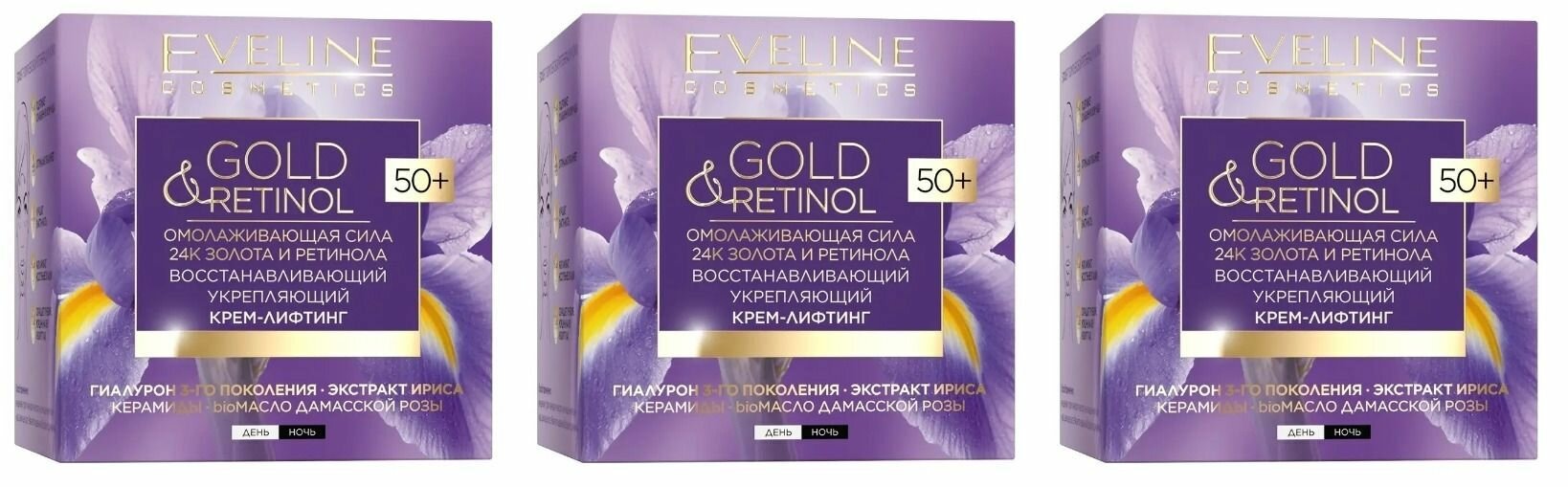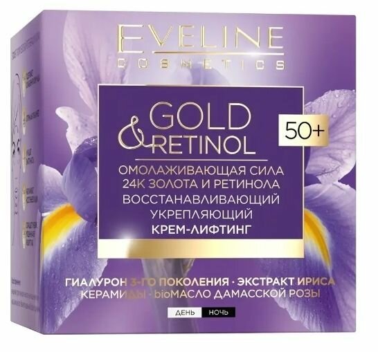 Регенерирующий питательный крем против морщин GOLD & RETINOL 50+ интенсивно разглаживает и укрепляет структуру кожи, комплексно борется с признаками старения, заметно сокращает глубину и длину морщин, выравнивает микрорельеф эпидермиса и укрепляет его защитные функции. Ретинол (витамин А) стимулирует клеточное обновление кожи и выравнивает тон. Чистое 24К золото способствует синтезу коллагена, интенсивно регенерирует кожу и замедляет процесс старения, заметно сокращая морщины. Гиалурон 3-го поколения (bioHyaCare) обеспечивает неинвазивное заполнение морщин и укрепление структуры кожи. Гексапептид нового поколения Dermaxyl ускоряет синтез коллагена эластина, сокращает видимость морщин. Ресвератрол и экстракт ириса усиливают антиоксидантную защиту кожи, предотвращают внутриклеточные повреждения свободными радикалами.