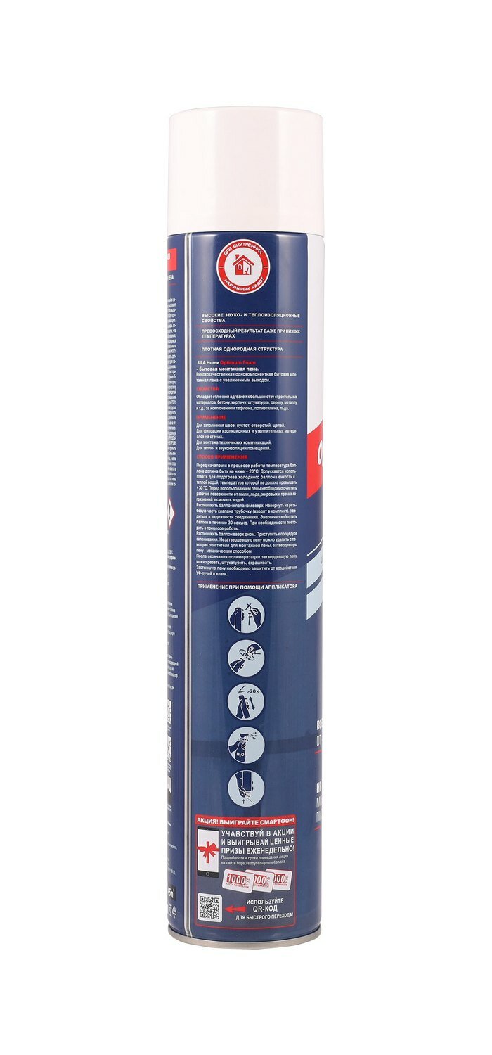 Бытовая монтажная пена для наружных и внутренних работ. Сочетает в себе качество профессиональной монтажной пены и удобством использования ее бытового аналога. Обладает равномерной структурой, отличной адгезией к большинству строительных материалов: бетону, кирпичу, штукатурке, дереву, металлу, и т. д. за исключением тефлона, полиэтилена, льда. Быстрая полимеризация. Качественный результат в любых погодных условиях. Применяется для заполнения швов, пустот, отверстий, щелей, для фиксации изоляционных и утеплительных материалов на стенах, для монтажа технических коммуникаций, для тепло- и звукоизоляции помещений.