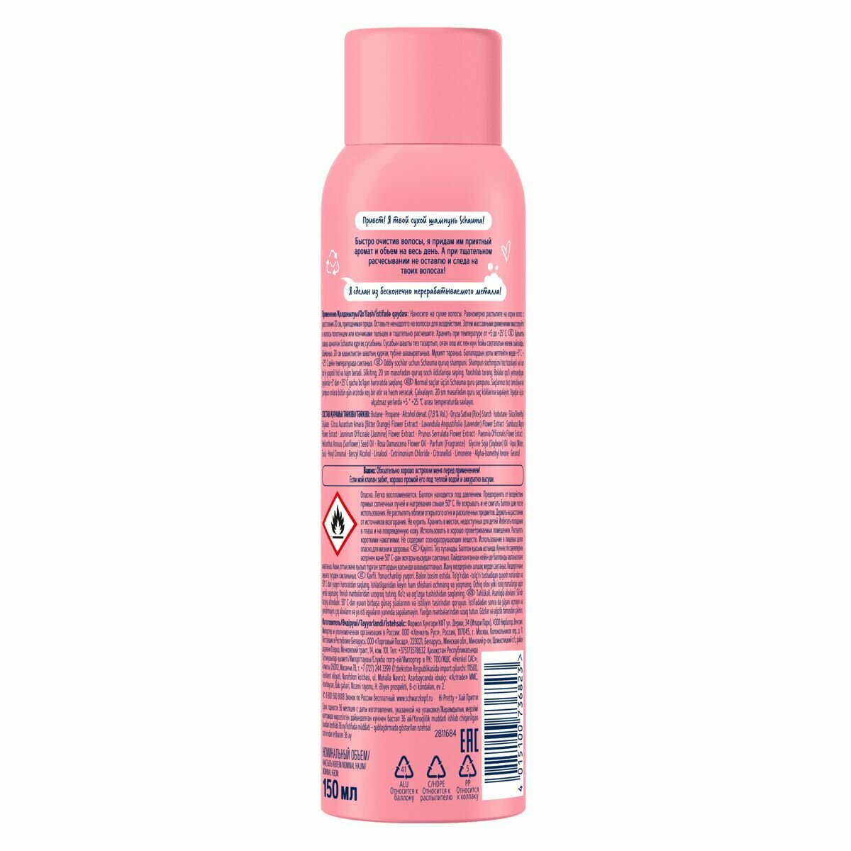 Сухой шампунь Schauma Hi Pretty! быстро очистит волосы, придаст им приятный аромат и объем на весь день. А при тщательном расчесывании не оставляет и следа на ваших волосах! Рекомендация по применению: наносите на сухие волосы. Равномерно распылите на корни волос с расстояния 20 см, приподнимая пряди. Оставьте ненадолго на волосах для воздействия. Затем массажными движениями в массируйте в волосы полотенцем или кончиками пальцев и тщательно расчешите.