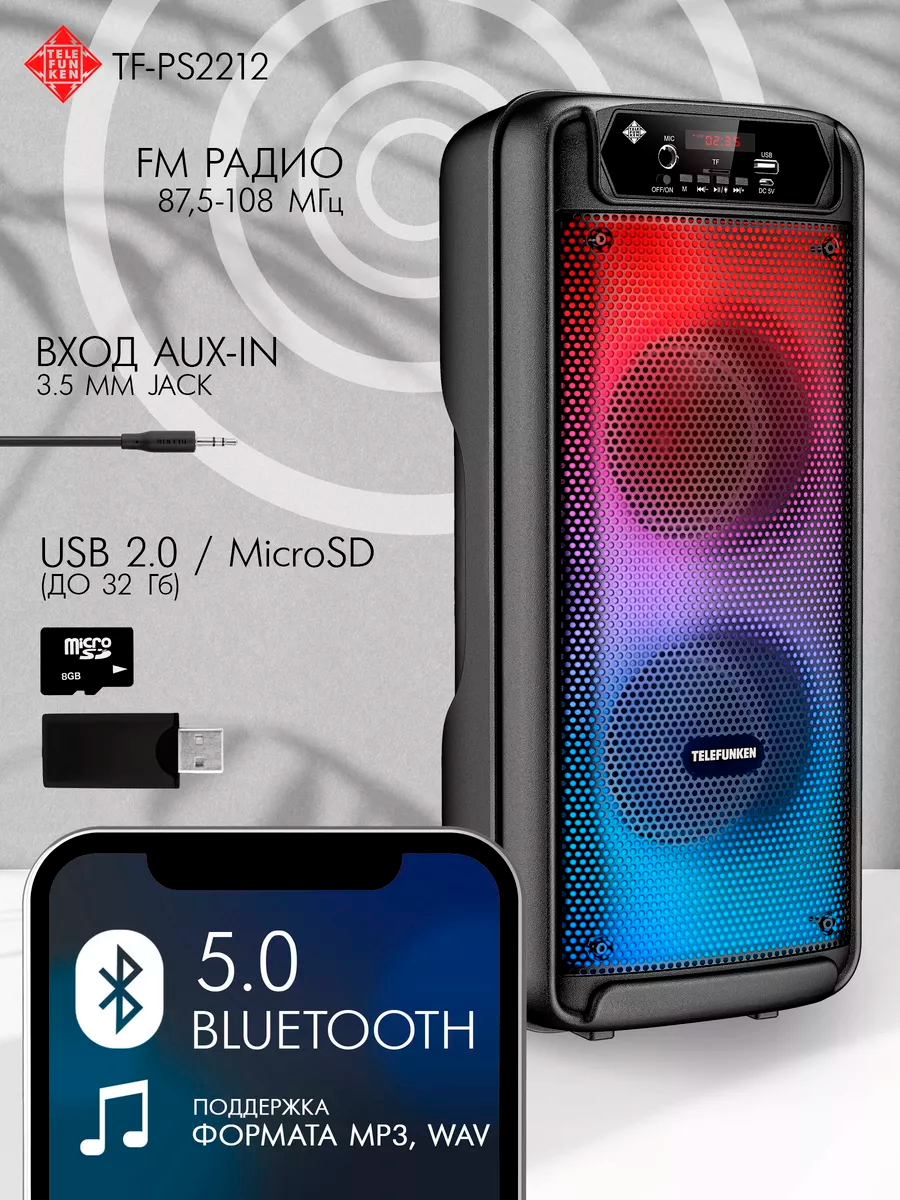 Многоцветная LED подсветка отлично выглядит при дневном свете, но особенно завораживает в темноте. Музыкальная выходная мощность - целых 60 Вт, при этом оснащена мощным аккумулятором (1800 мАч), который будет радовать Вас любимой музыкой до 8 часов подряд. Мини система поддерживает MP3, позволяет воспроизводить музыку через Bluetooth, с USB и SD-носителей, при подключении любого гаджета через AUX. В комплект входит пульт дистанционного управления (ДУ), сможете переключить любимый трек на расстоянии. Функция TWS - при объединении двух колонок можно увеличить общую мощность в два раза и создать стереосистему, чтобы получить полноценный объемный звук на вашем танцполе. Для любителей караоке в новинке предусмотрен микрофонный вход. Переносной музыкальный центр Telefunken TF-PS2212 станет неотъемлемым поводом для вечеринок у вас или ваших друзей.