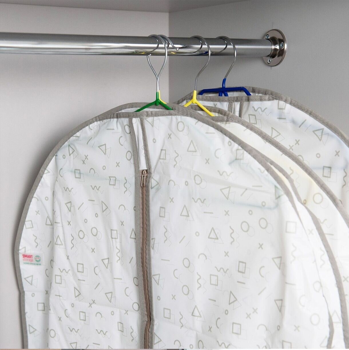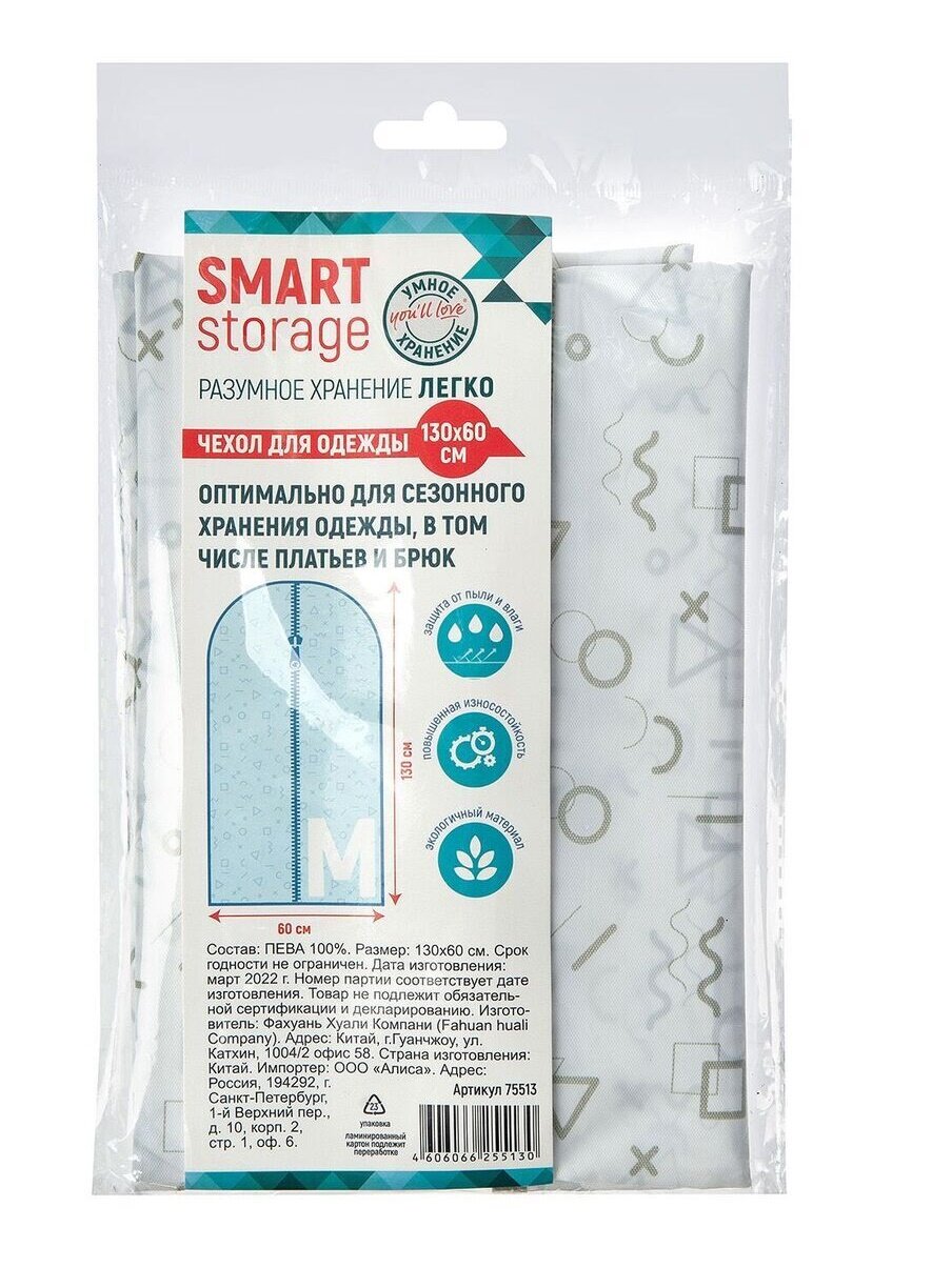 Серия Smart Storage - идеальное решение проблем хранения. Чехол прозрачного цвета с ненавязчивым принтом отлично защитит одежду от посторонних запахов, пыли и влаги. Удобная застежка-молния обеспечит комфортное использование. Размер 130*60см подходит для хранения платьев, плащей, брюк.