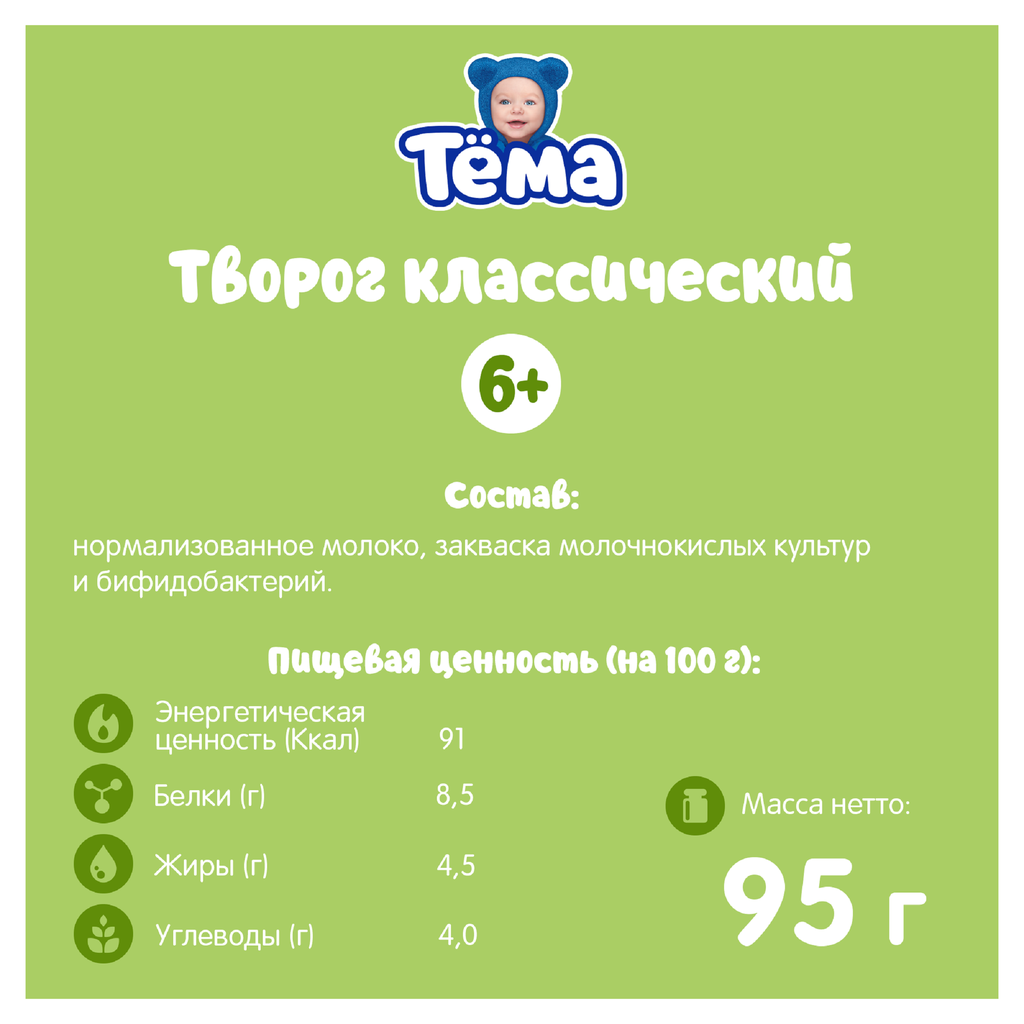 Детский творог Тёма изготовлен из отборного молока от проверенных поставщиков. - Натуральные ингредиенты. - Содержит бифидобактерии. - Производится из свежего молока, которое каждый день привозят с местных ферм. - Проходит строгий контроль качества на всех этапах производства. Тёма. Говорим как есть.