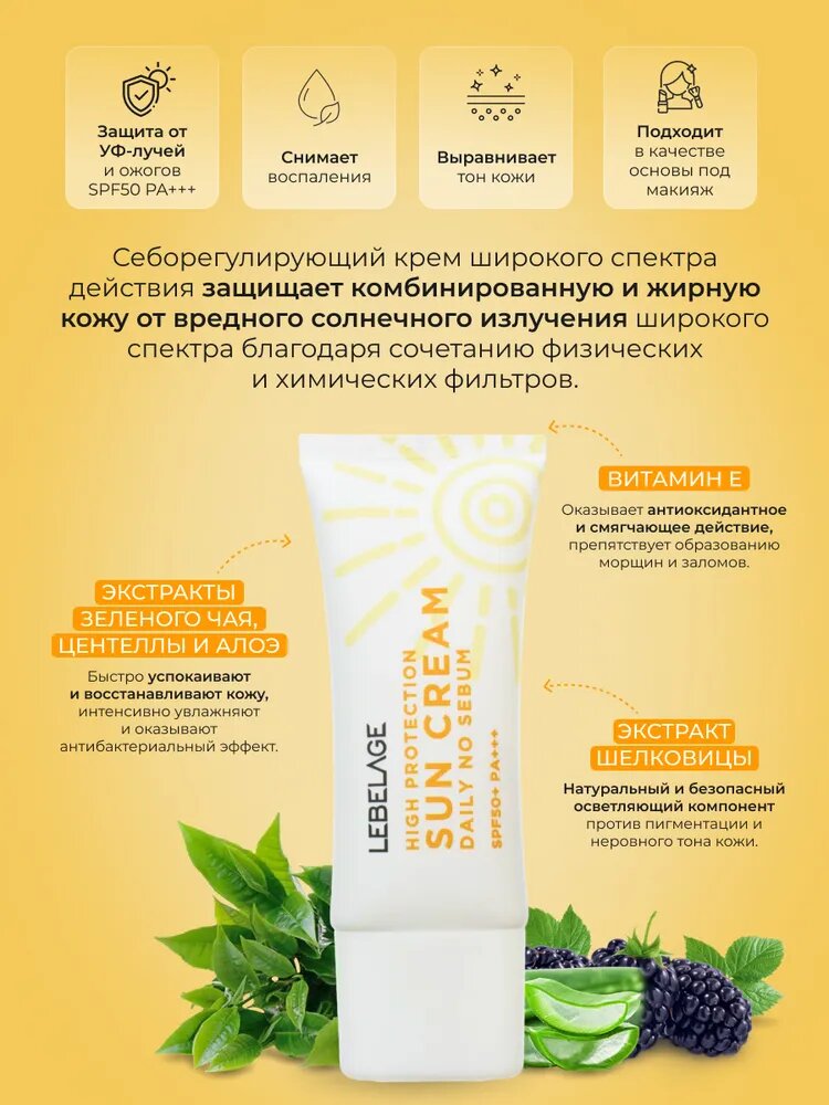Солнцезащитный крем Lebelage High Protection Daily no sebum - это идеальное средство для защиты вашей кожи от вредного воздействия солнечных лучей. Он обладает высокой степенью защиты SPF 50, благодаря которой ваша кожа будет надежно защищена даже в самые жаркие дни.